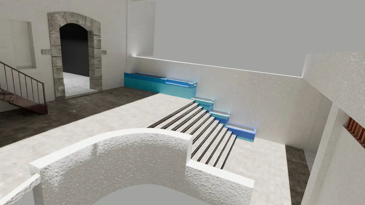 habitacion de 2 niveles estilo colonial, con escaleras de metal, puertas de piedra