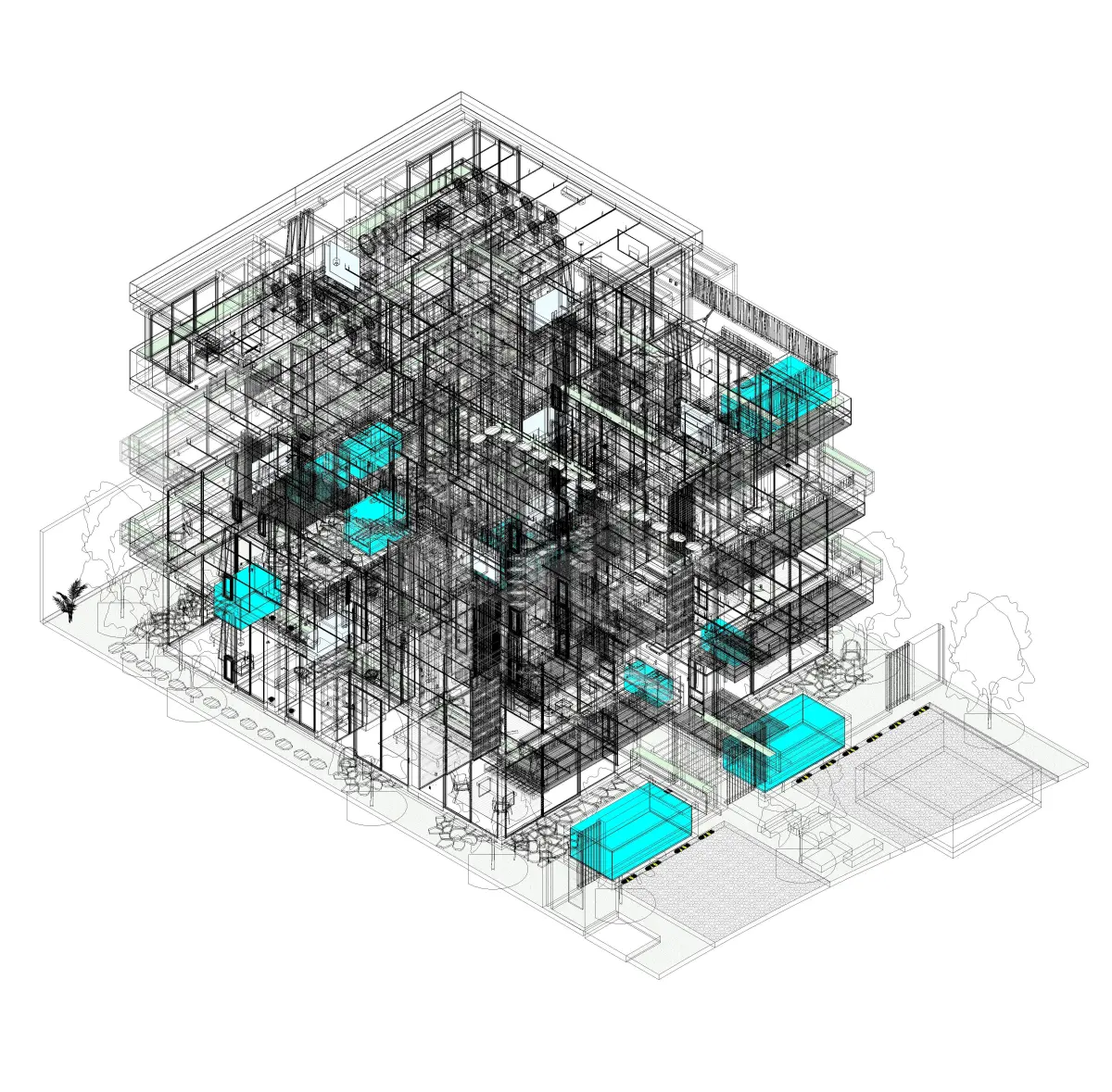 Proyecto de Revit para un edificio residencial en la costa cerca al mar. Cada departamento tiene su propia piscina.Nivel de detalle 350***Incluye:***TexturasFamilias únicas como familias de platinado de detalle 2d 60 planos de construcción en detalle que incluye-Electricidad-Acabados-Paisajismo y exterior-Carpintería -Planos de obra en aluminio -Sección de detalle ilustrada y sección de perspectiva