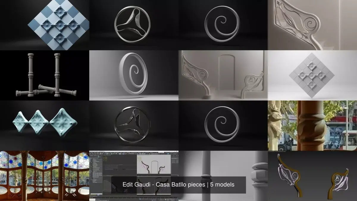 A gathering of notable sculptural elements from the Casa Batllo, by the great Antoni Gaudi.Native format of all files are 3dsmax 2021, Vray renders, with the edit poly + turbosmoothed technique used on almost every object.