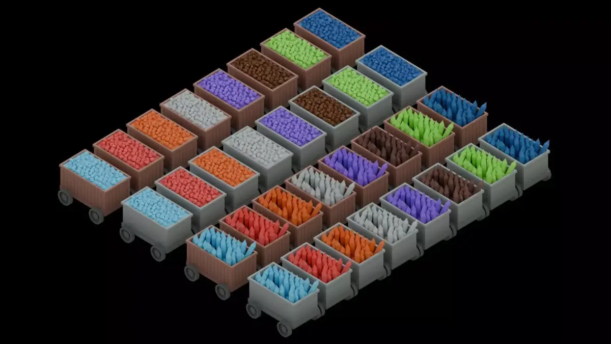 Mine carts and railsCrystals, ores, and resource variationsWooden crates and barrelsMining tools (pickaxe, shovel, hammer)Lanterns and propsTent and camp elementsEnvironmental props (cactus, rocks, resources)