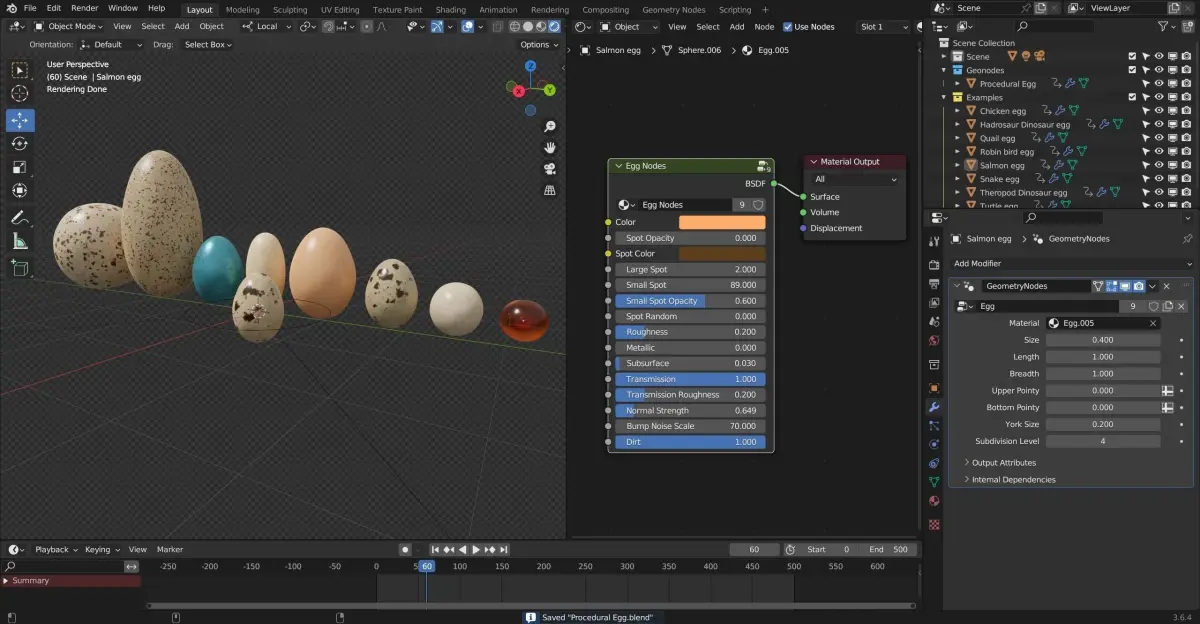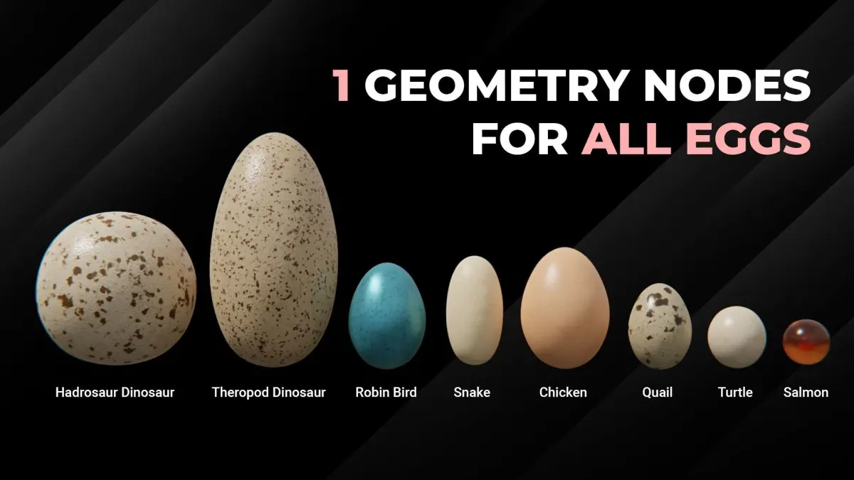 My Procedural Egg Geometry Nodes for Blender 3.6 and higher version. This is my set of 3D egg with procedural shell shape and color. With this tool, we can create all kinds of eggs with countless unique variations jusr by edit parameters.Hope you like it!
