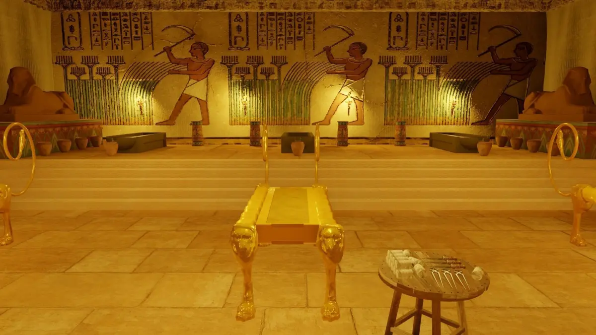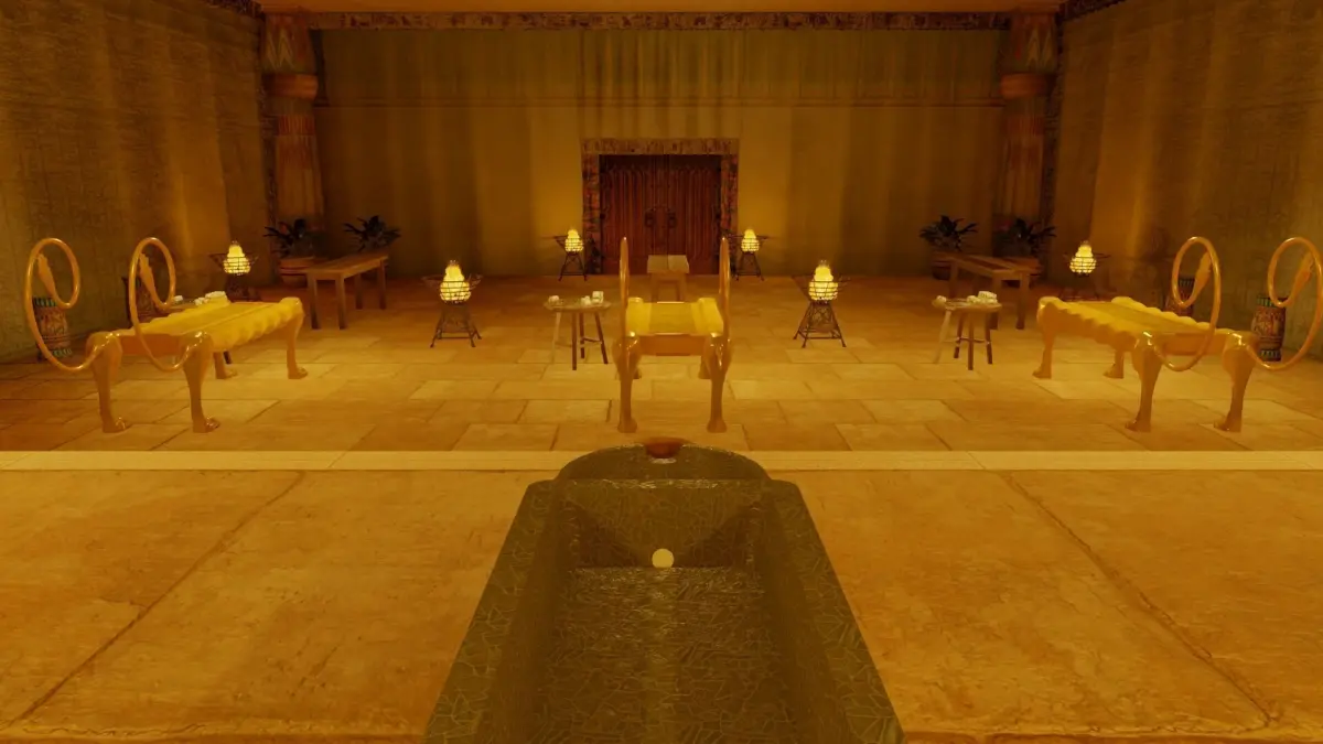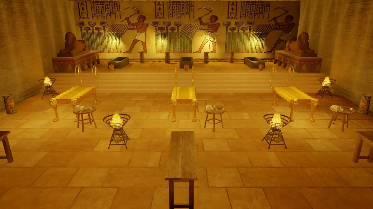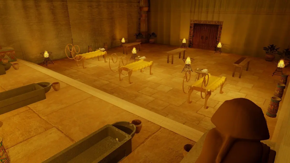 Upon entry, you'll find three standard mummification tables, where the final wrapping and sealing rituals occur
