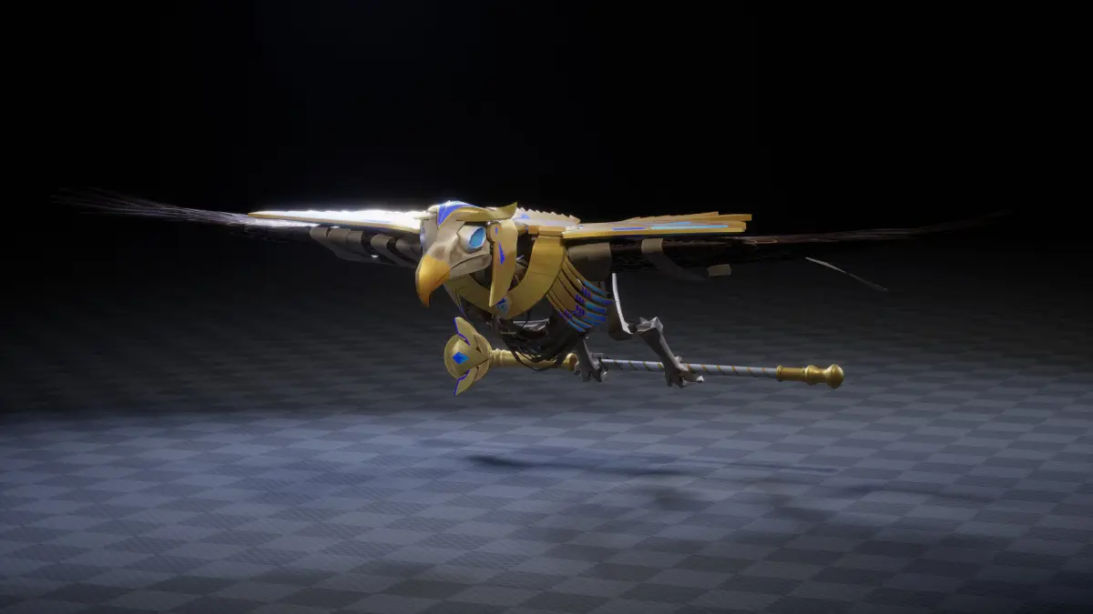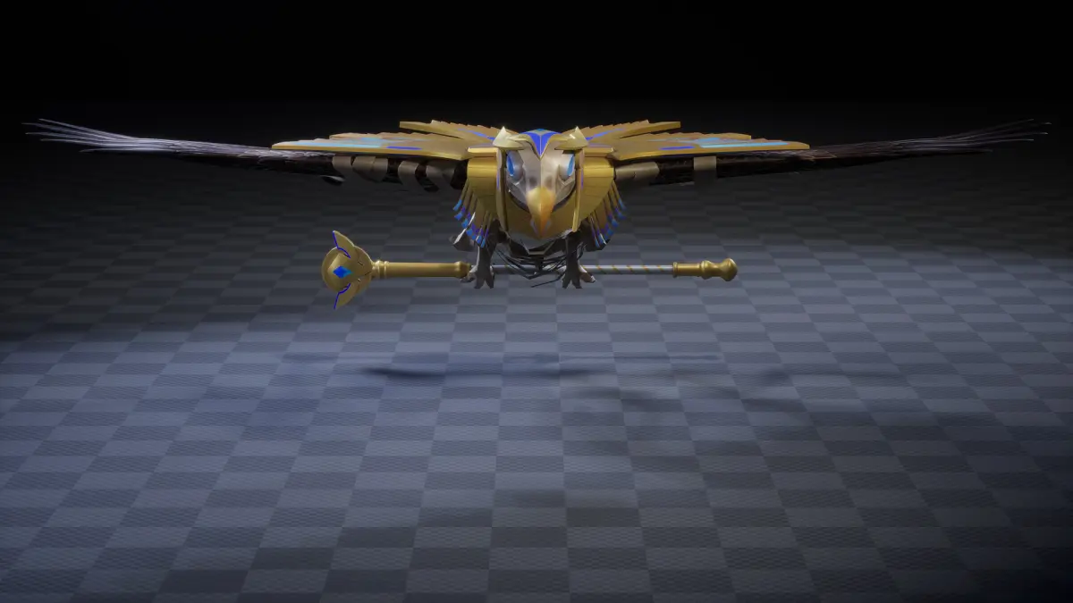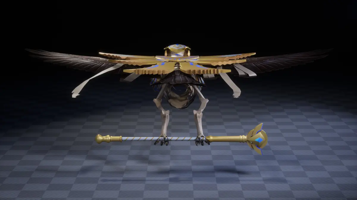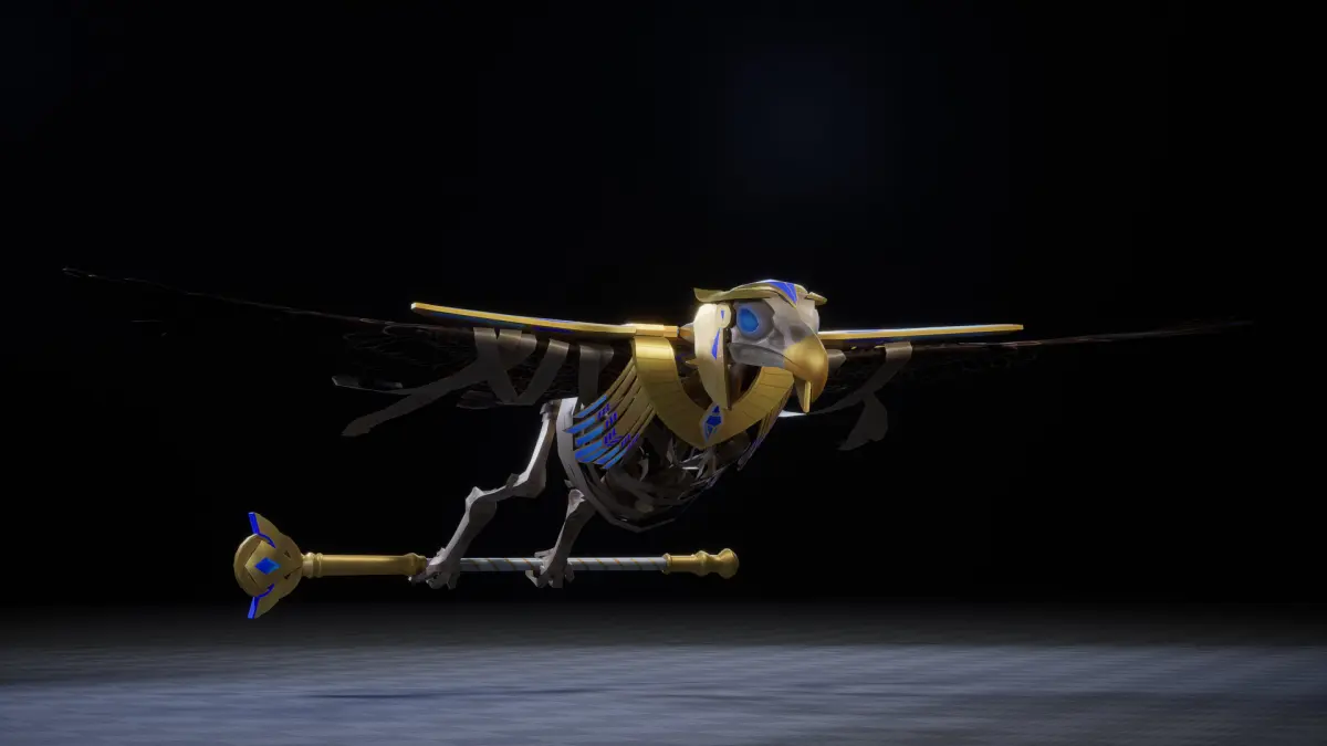 This is a 3D model of a mystical skeletal falcon adorned with ancient Egyptian armor, designed for fantasy, mythology, and sci-fi projects. The creature features a bird-like skeletal structure with detailed wing bones and elongated claws gripping a golden staff, giving the illusion of a flying undead guardian. Intricately designed golden and blue ornamental armor covers the chest, back, and head, reflecting Egyptian royal aesthetics. The falcon’s glowing blue eyes, elegant curves, and semi-transparent ribbons bring divine energy to the model, blending mysticism and technological grandeur. Its overall design hints at a celestial or undead protector, ideal for use in fantasy RPGs, cinematics, or magical realms. Modeled and rendered with high-resolution detail, this asset is perfect for Unreal Engine, Blender, and Maya-based workflows. Whether used as a summonable creature, guardian spirit, or mythical mount, this model will elevate any game or animation project with its majestic and enigmatic presence.