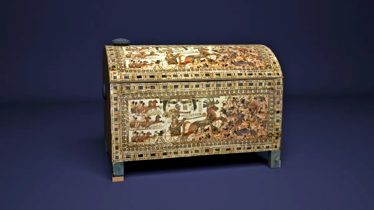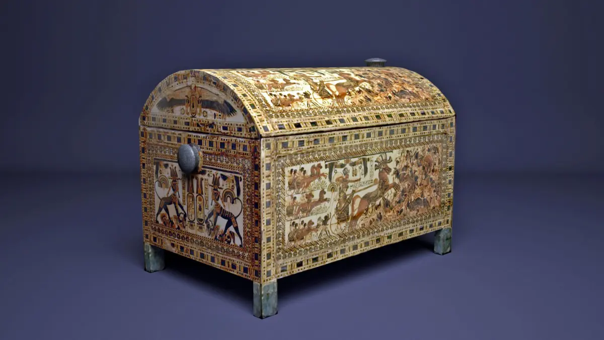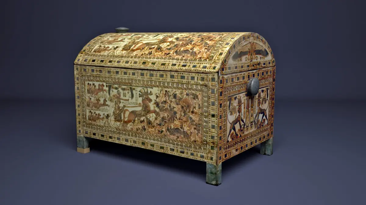 Egyptian King tutankhamun chest Painted Wooden ChestOne of the most intricately decorated objects in the tomb, this wooden chest, which was found in the Antechamber, illustrates the innovation of the frenzied battle. A fierce confrontation takes place on both sides of the box; pictured here is the king in his chariot fighting against the Asiatics. On the other side the king battles against the Nubians. Scenes such as these were the apparent influence for the artists who composed the military reliefs for the pharaohs of the Nineteenth Dynasty, where the enemy is also frequently depicted as a confused mass without the traditional registers. The absence of these groundlines make possible the chaotic disarray of the enemy. Chaos and disorder were anathema to the ancient Egyptian, since they represented the opposites of maat, the balance and harmony upon which the entire culture was based. these battle scenes, therefore, appear to have symbolic significance.