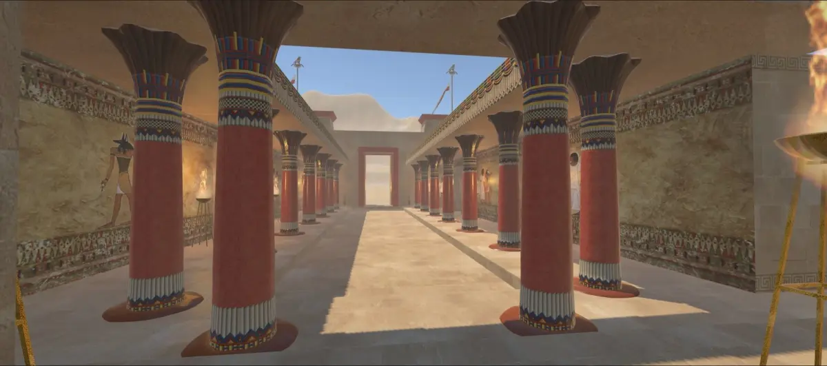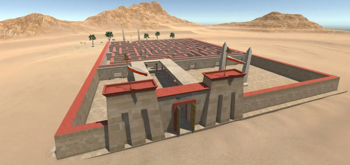 Fiction Egyptian labyrinth next to a temple with walls and a big entrance door originally created for Unity. Inside the temple there are several elements Egyptian style, like oil lamps, pottery, obelisks, treasure chests....etc. The target is managing to get out of the labyrinth and collecting all the treasures. The FBX models and textures are included separately to be used in other 3D apps. (If you are not using Unity, you will have to assemble the scene in the program you are using for it). All the models are low-poly to be used in games and applications. A version created and configured in unity for VR Oculus Quest 2 is included.