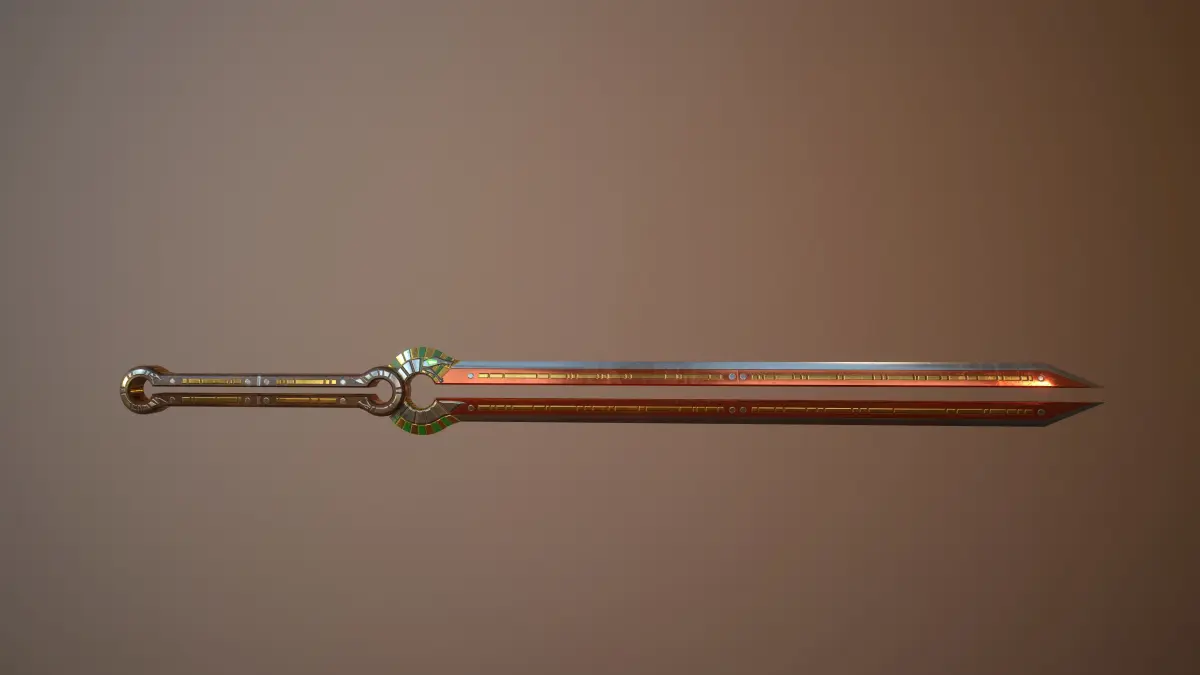 One-Handed Sword of Apophis, ancient Egyptian deity also known as Enemy of Ra, Lord of Chaos, the World Encircler.He had been the former chief god, dethroned by Ra who sealed his energy in a bronze battle equipment and sent him to the underworld.The evil ocular power that Apophis used against Ra was sealed in the weapons, from which it spreads forth emitting a green glow and the golden scales from the god's snake body were taken as decoration.