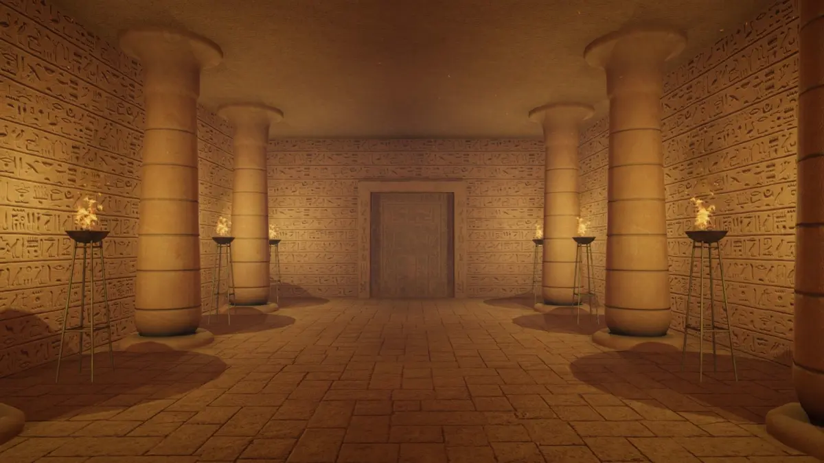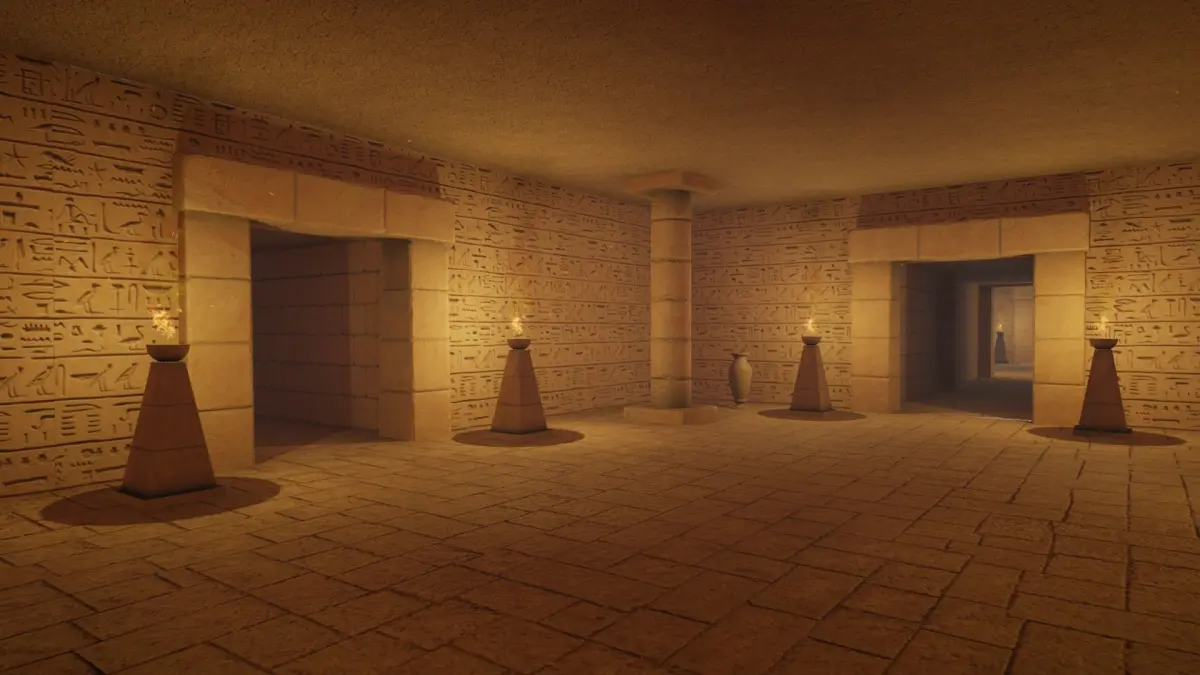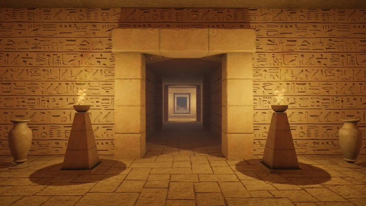 2) Exterior scene with pyramid and desert environment.