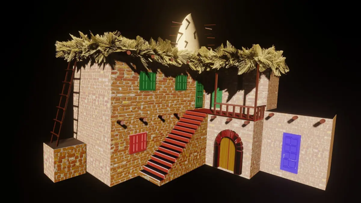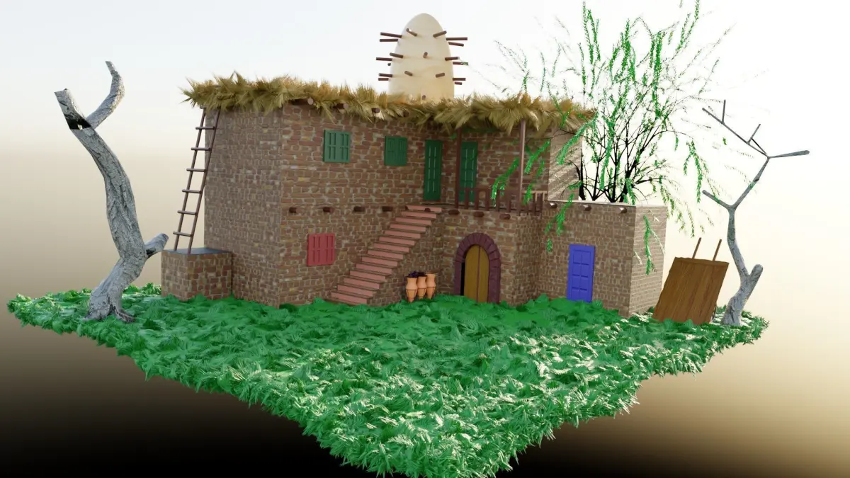 The3D model of a traditional Egyptian village house captures the essence of rural life in Egypt, showcasing a blend of practicality and cultural heritage. The house features a rectangular shape, with thick mudbrick walls that provide insulation against the desert heat. The façade is adorned with decorative patterns, reflecting local craftsmanship and artistic traditions.The roof, flat and accessible, is typically finished with a layer of mud and straw, ideal for cooling . Windows are minimal, designed to reduce heat but often framed with wooden shutters that add a rustic charm. A small courtyard may be present, With an open eating area with the famous Tablia, local ground eating table, and Kola, local drinking water container for table use, and also for social gatherings. also containing a garden with local Trees.A Zeir,Local drinking water container made of potery covered with wooden cover and drinking cup known as Kooz is present. At the far end the local transportation cart know as Carro, ofter pulled by domestic animals like Donkey or horse and in shorter trips pushed by the peasant himself.At the top of the house appears a Pigon breeding tower that adds charm and charecter to the scene.The whole scene is magical and alluring.