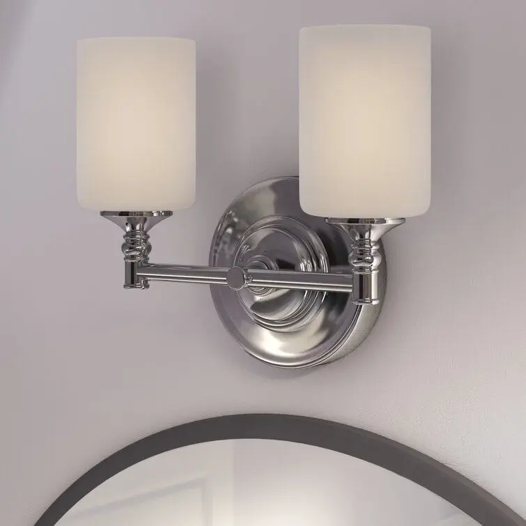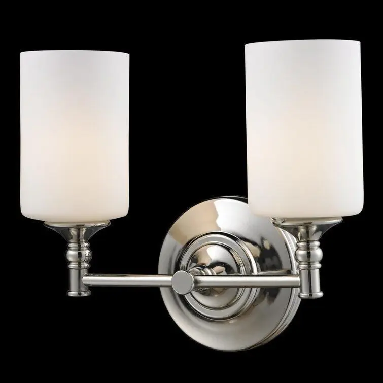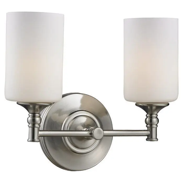 - Matte opal glass shades rest elegantly upon beautifully designed hardware, creating a look that is uniquely modern. This two-light vanity fixture will add a touch of modern class where ever it is hung.