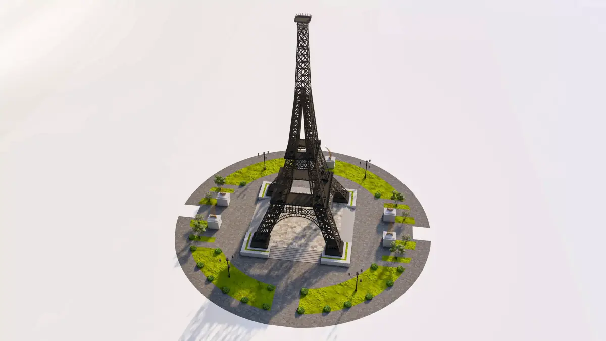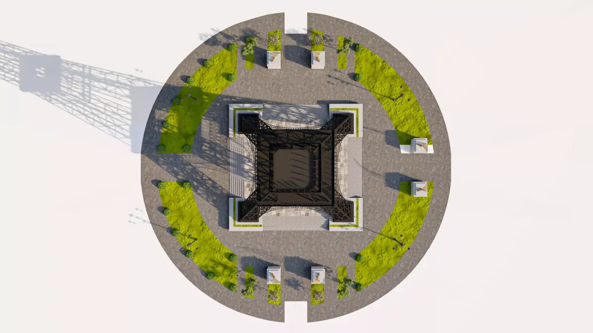 This is an extensive, high-detail 3D model of a Formal Public Garden/Urban Park, heavily inspired by the grand scale and structured geometry often found in famous landscapes like the Champ de Mars surrounding the Eiffel Tower. The model emphasizes a strong circular and radial design principle.