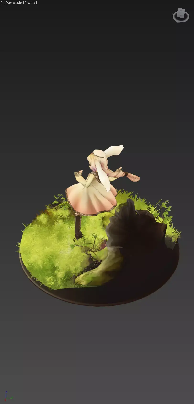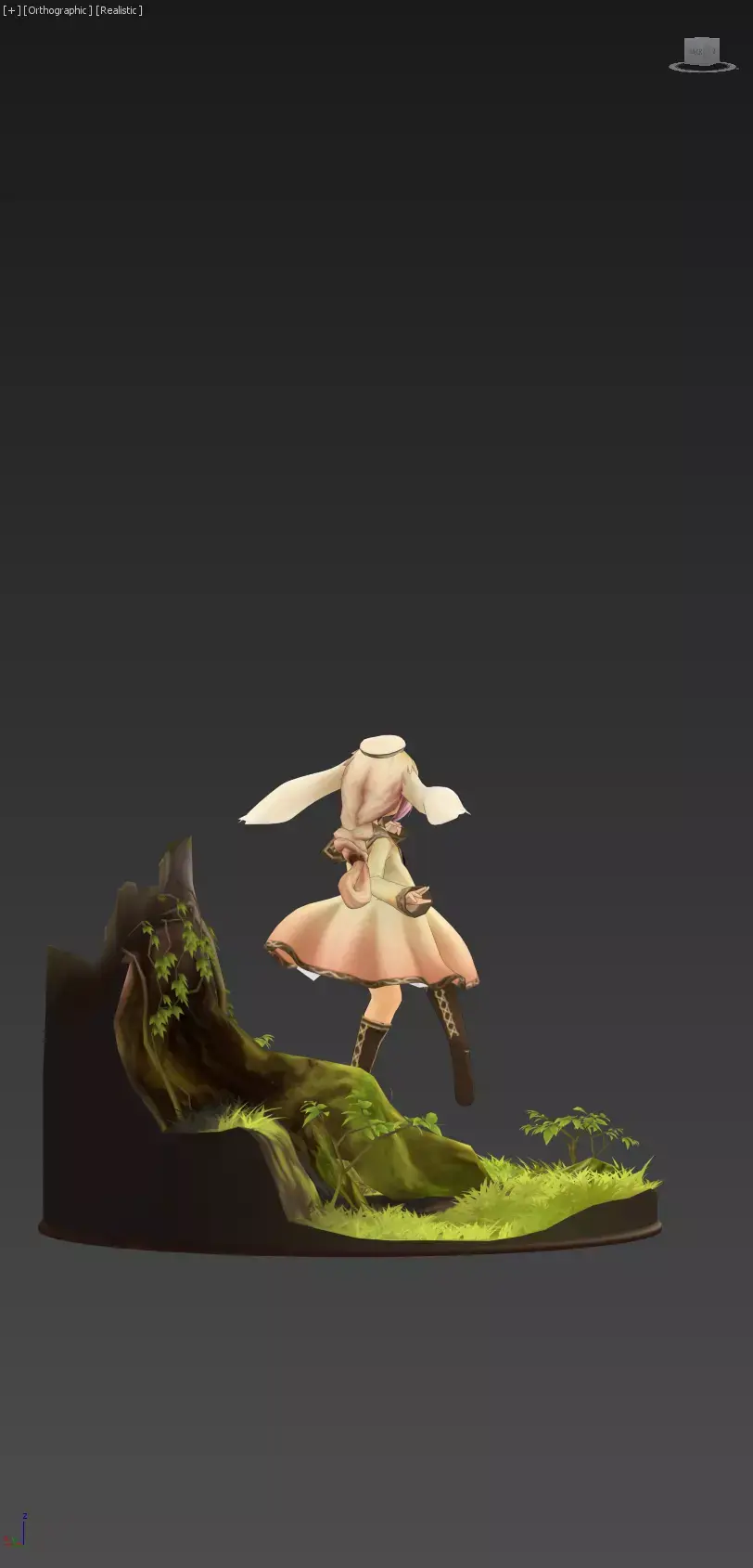 Elara is a whimsical and enchanting figure, a guardian of the forest with a playful, rabbit-like appearance. Her design features long, floppy ears and an innocent expression, hinting at a gentle and curious nature. She wears a flowing, light-colored tunic and dark boots, and her hands are posed as if she is casting a spell or reacting to something unseen. She is depicted standing on a beautifully rendered base of lush green grass and a weathered tree stump, which roots her directly in a natural, magical setting. Elara embodies the spirit of the woods, a protector of its secrets and a creature of pure fantasy.