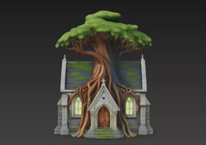 The Overall Concept This structure represents the perfect union of nature and civilization. It is a stone chapel or shrine that has been reclaimed by the forest, or perhaps built specifically by Druids to honor the Mother Tree. It fits perfectly in an enchanted forest, an elven city, or a sacred grove.