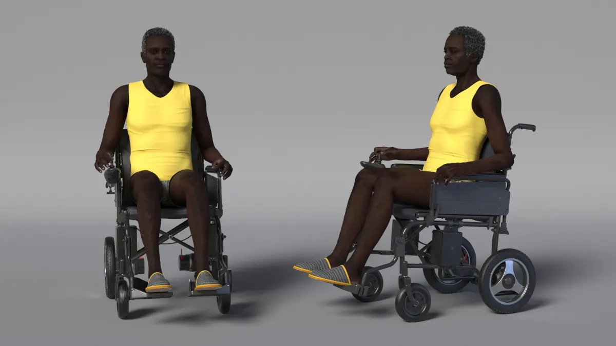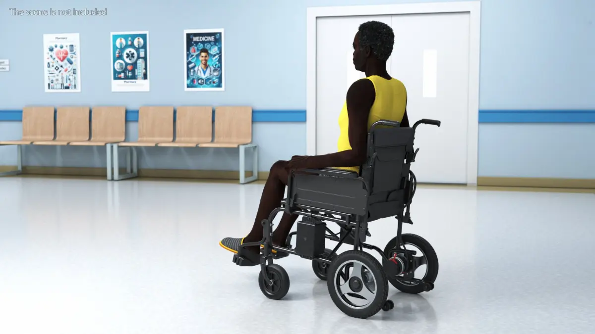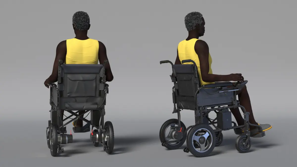 Elderly Man Sitting in the Electric Wheelchair is a 3d model of a senior individual using a modern, motorized wheelchair designed for enhanced mobility and comfort.
