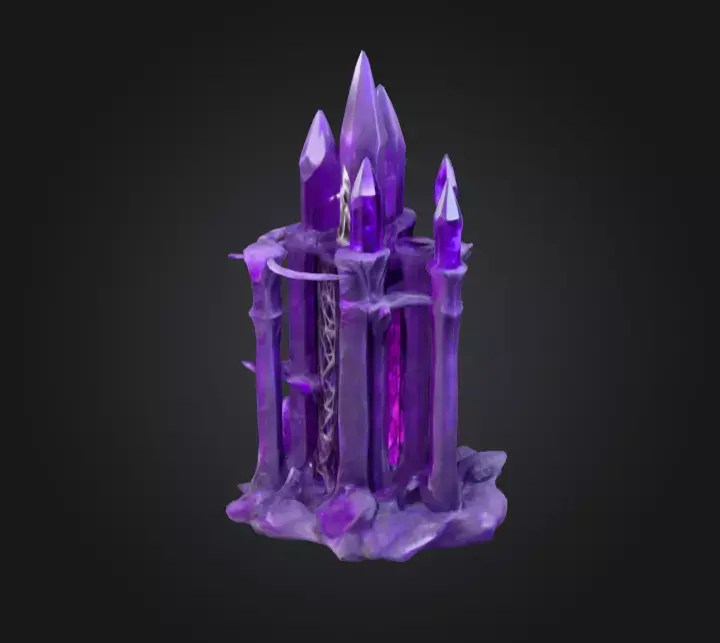 The design conveys more than simple mineral growth—it feels alive, almost sentient. The crystals are fused together by a dark, organic-looking base, as if the earth itself molded them into a sacred relic. With their sharp, elongated forms, they appear both beautiful and dangerous, symbolizing the thin boundary between wonder and peril in mystical landscapes. The inner glow, a radiant purple luminescence, creates the impression of unstable energy pulsing within, perfect for settings steeped in sorcery, forbidden knowledge, or otherworldly magic.