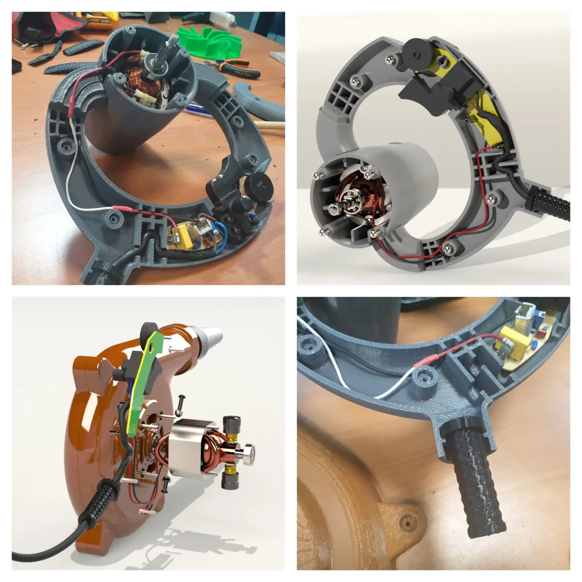 This Electric Air blower which is simple and effective electrical device used in industries to blow away dust from every nook and corner. This device was designed in intent to be 3d printed ( Additive manufacturing) using FDM process. For the most parts I used PLA with different colors, however I used Orange ABS plastic with high temperature melting for the Impeller due that it has contact with the rotor, as we know that the temperature of the rotor rise after rotating therefore the rotor will transfer the temperature by the effect of conduction. Additionally I used small aluminum hub in the center of the impeller to avoid any direct contact between the shaft of the rotor and impeller moreover help the dissipation of the heat. The other type of plastic used in this device is Flexible material, as you can see the real and render pictures the material is used in the front part Funnel, cable protector and in the handle for cushion your grip. In general, recommended speeds for flexible filament is between 1800mm – 2400mm/min for optimal print quality and timing and the recommended extrusion temperature range is between 225-250°C.