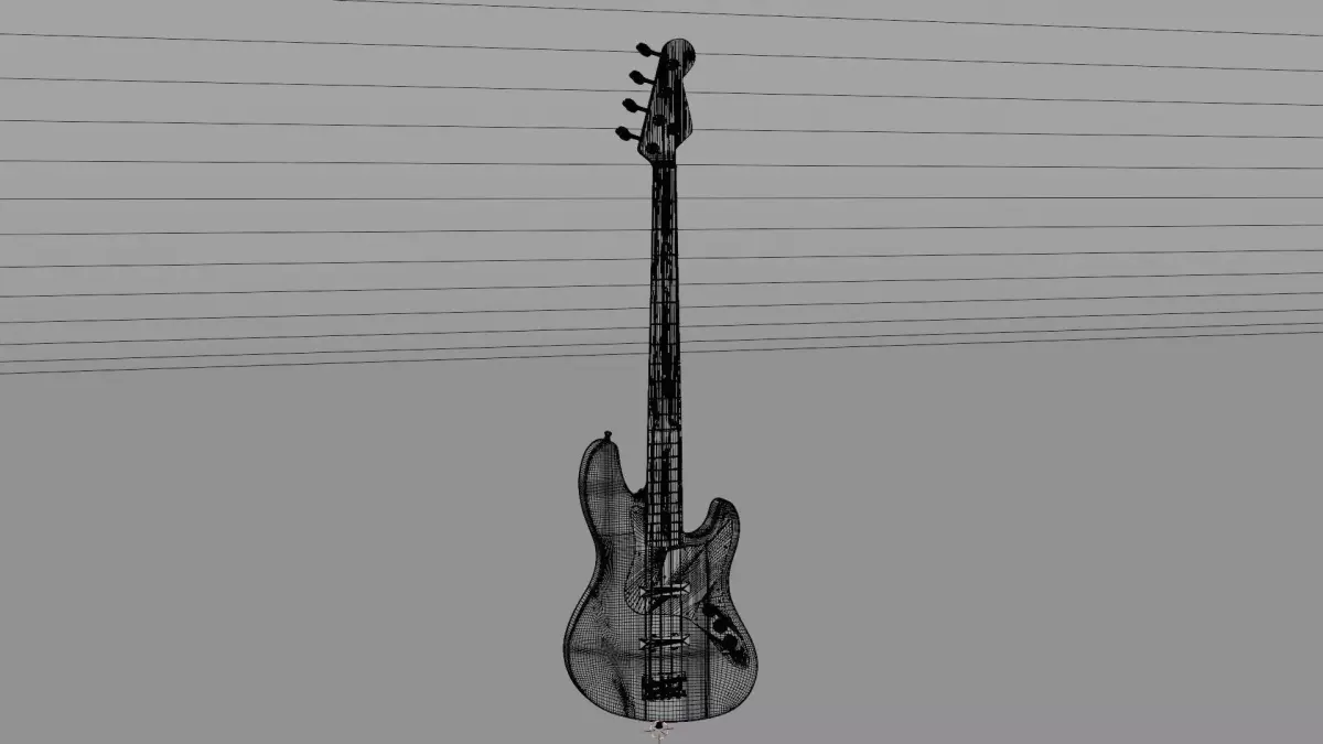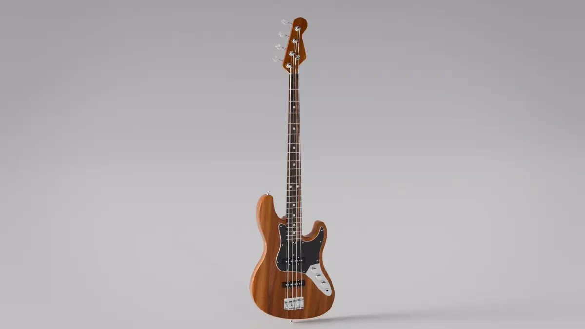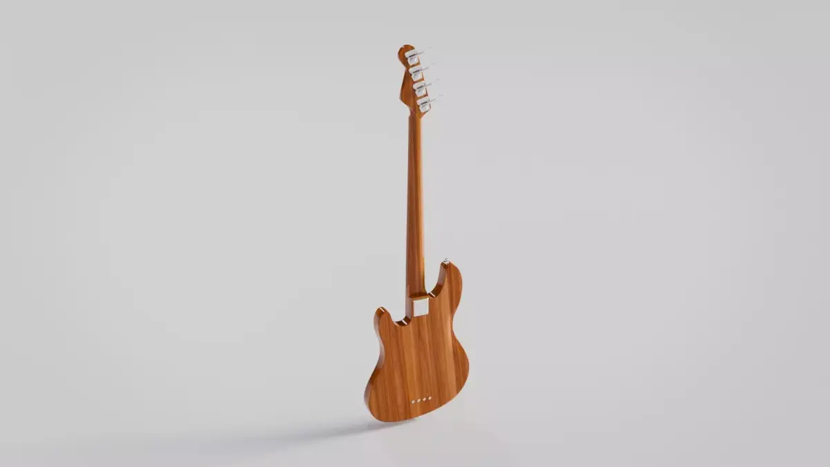 This high-quality electric bass guitar 3D model is a realistic representation of a modern solid-body bass guitar with a natural wooden finish. The model features clean, well-defined geometry, detailed pickups, bridge, control knobs, strings, and fretboard, making it suitable for both close-up renders and real-time applications.