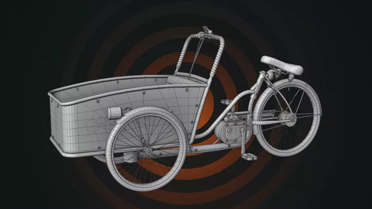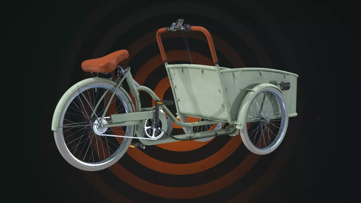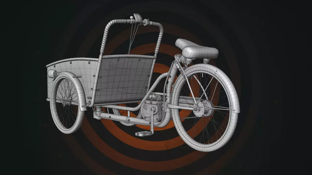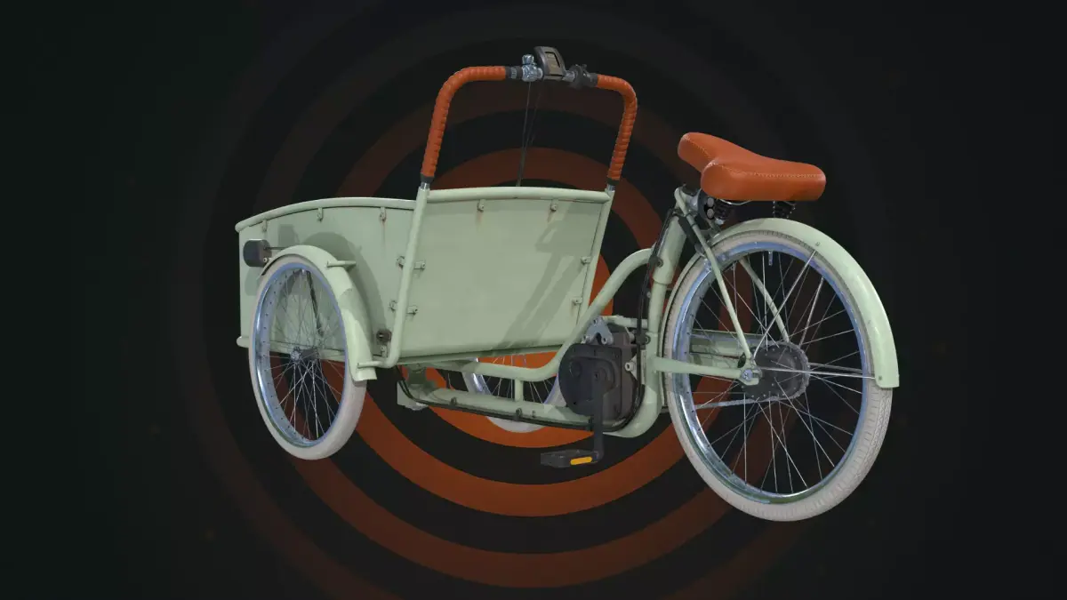 This is a high-quality, realistic 3D model of an Electric Cargo Tricycle, designed for urban delivery, logistics, and eco-friendly transport visualization. The model features a large front-loading cargo tub, an integrated electric motor, and a stylish vintage-inspired frame. It is perfect for architectural visualization, urban environment renders, and commercial advertisements.