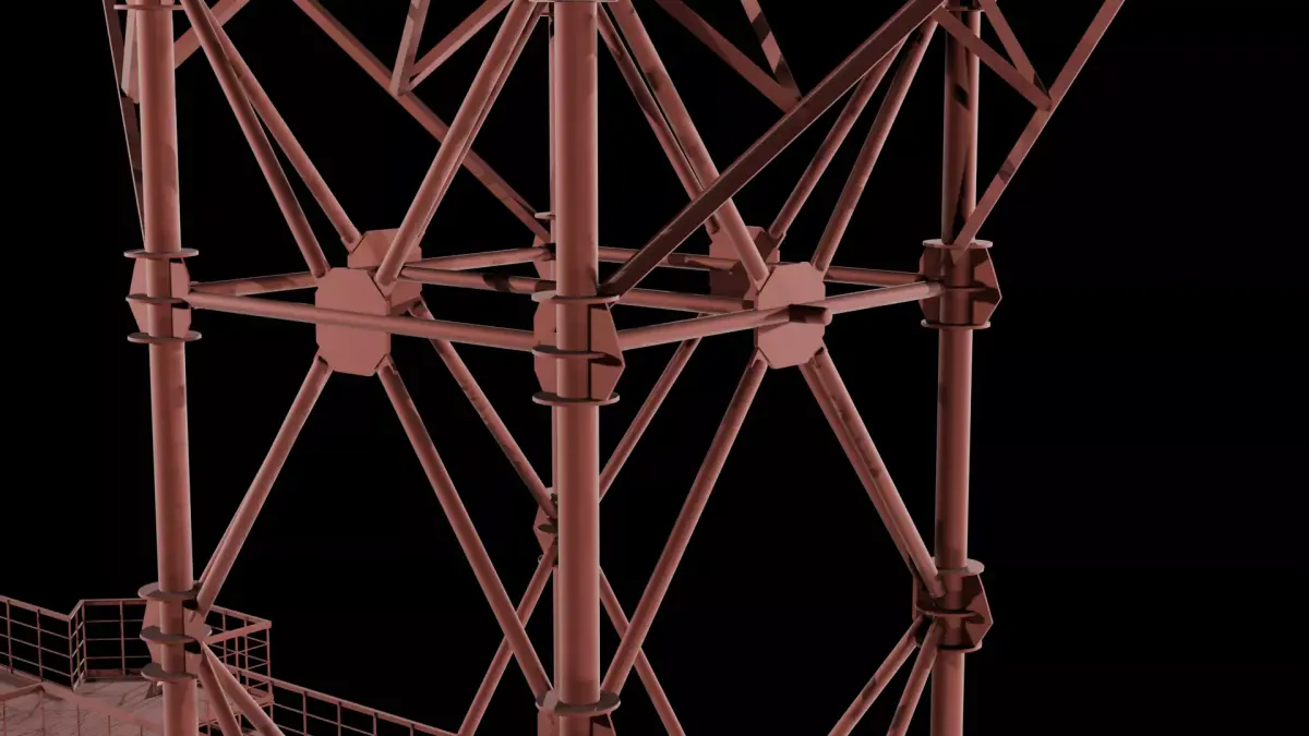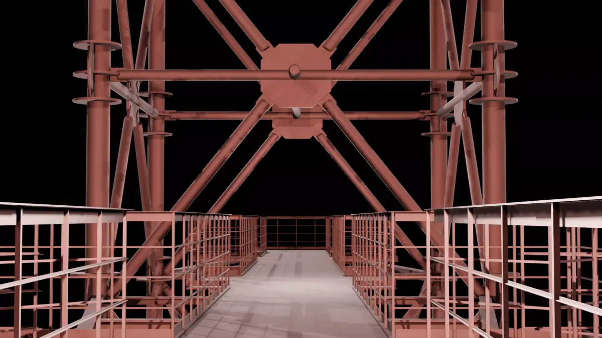 The model is meticulously detailed, including complex truss geometry, realistic welded joints, and integrated maintenance platforms with railings at multiple levels, offering excellent opportunities for player interaction and environmental storytelling.