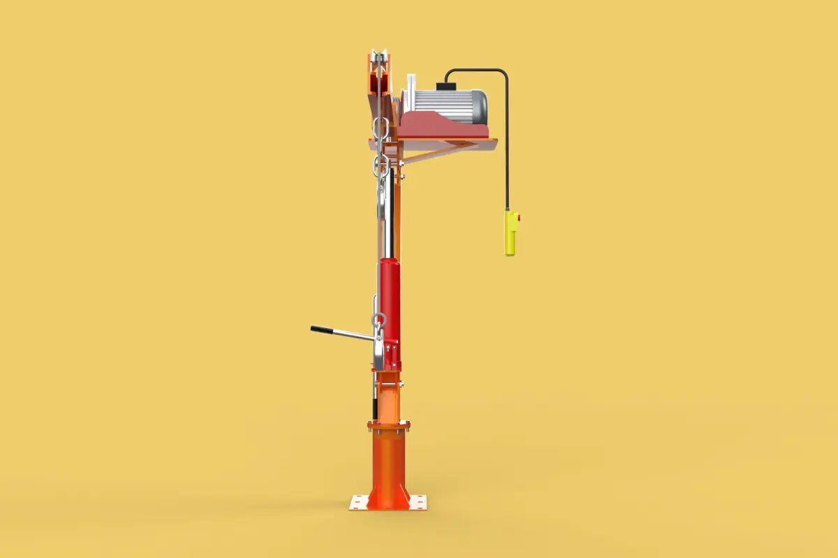 Workshop Crane: Designed for stationary use within a workshop or similar enclosed environment. Typically mounted to the floor or a sturdy base for maximum stability.Hydraulic Lifting System: Utilizes hydraulic cylinders and a powered hydraulic pump (usually electric) to provide smooth, powerful, and controlled vertical lifting of the entire boom and attached hoist/winch mechanism.Swivel/Slewing Boom: Features a jib arm that can rotate horizontally (slew) around a central pivot point, allowing for a wide working area without moving the crane's base. The swivel mechanism is often power-assisted (electric or hydraulic) and may also be controlled remotely.Electric Remote Control Hoist/Winch: Incorporates an electric hoist (using chain or wire rope) or an electric winch (primarily using wire rope) for the powered lifting and lowering of loads. The remote control allows the operator to manage these vertical movements from a safe and optimal vantage point.Hook Attachment: A robust hook is attached to the lifting cable or chain of the hoist/winch for secure connection to loads using appropriate lifting gear.Load Capacity: Engineered with a specific lifting capacity determined by the hydraulic system, the electric hoist/winch, and the crane's structural integrity.Adjustable Boom Length (in some models): Certain models may offer a telescopic or adjustable jib arm to provide variable reach for different tasks.Safety Features: Includes comprehensive safety mechanisms such as overload protection on both the hydraulic and electric systems, limit switches on the hoist/winch to prevent over-travel, locking mechanisms for the swivel, and emergency stop controls on the remote and/or crane body.Electric Power: Requires connection to an electrical power supply for both the hydraulic pump and the electric hoist/winch.Remote Control Operation: Allows the operator to control lifting, lowering, and potentially slewing functions from a distance, enhancing safety and visibility. Benefits: