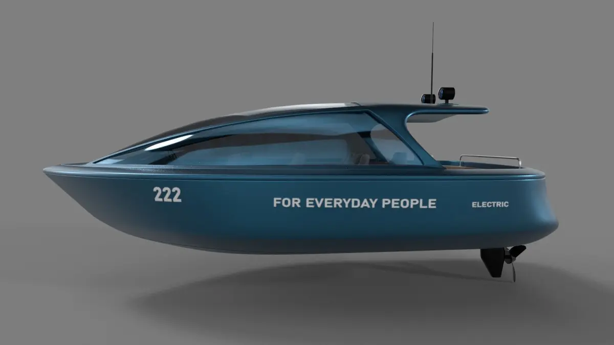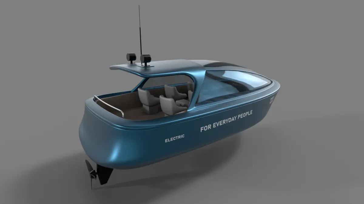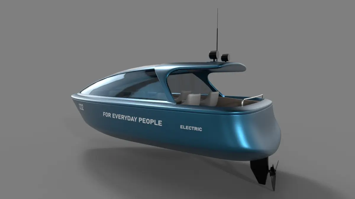 An electric boat designed for civilians, featuring a futuristic design with a transparent hull that allows a view of the water below. The boat is painted in a shimmering blue hue, blending seamlessly with the current timeline. It is powered by advanced electric motors, ensuring a smooth and eco-friendly sailing experience.