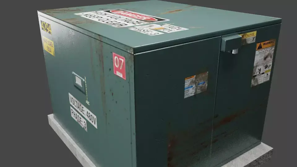 A photorealistic, low-poly 3D model of an industrial electrical distribution box (fuse box). Designed for real-time rendering, game engines (Unity/Unreal), and industrial visualizations. The model features a distinct weathered look with detailed rust, grime, and safety signage, making it perfect for urban street scenes, factory environments, or post-apocalyptic settings.