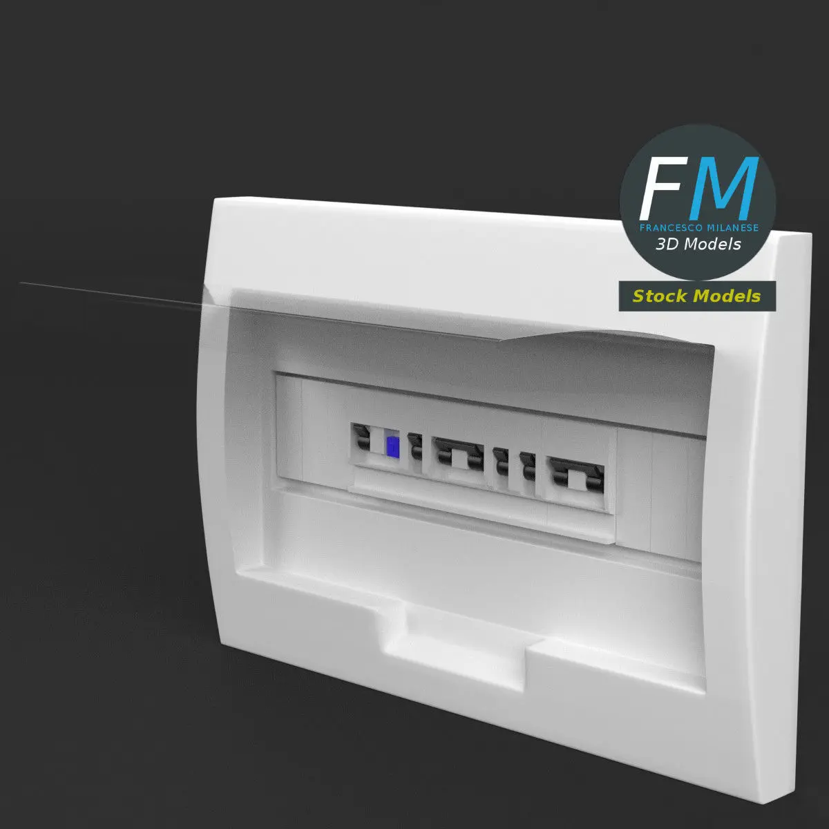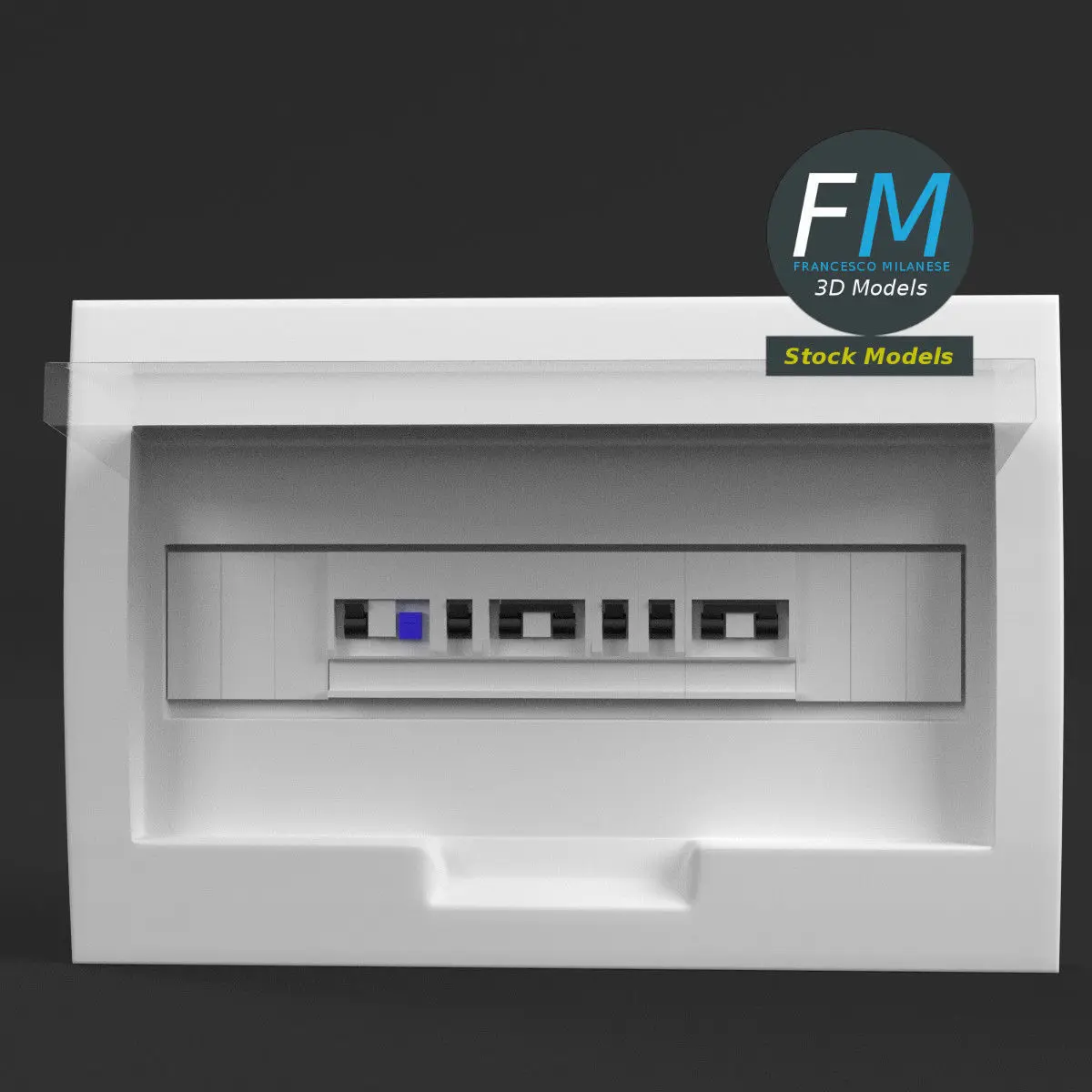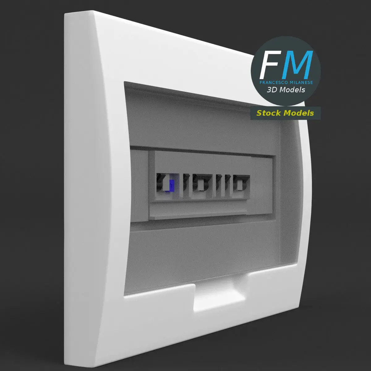 Electrical panel 3D Model. 9 individual objects (case, cover, levers, test button; so, you can easily rotate or even animate the levers), sharing 2 non overlapping UV Layout map, Materials (main, cover) and PBR Textures set. Production-ready 3D Model, with PBR materials, textures, non overlapping UV Layout map provided in the package.Quads only geometries (no tris/ngons).Easily customizable: UV unwrapped geometries, so you can create new Textures (or modify the existing ones) using the UV Layout maps provided in the package (as png with alpha).Each Object, Material or Texture provided in the package has a unique, meaningful name.Made in Blender 3.1 with a Cycles PBR shader with textures included (principled and Eevee compatible), then exported to OBJ and FBX; materials and textures made in Substance Painter, exported for PBR, V-Ray, Unity, Unreal.PROMO IMAGES: the first image has been rendered in Cycles for Blender; in particular, you can find 11+ promo images in this description: