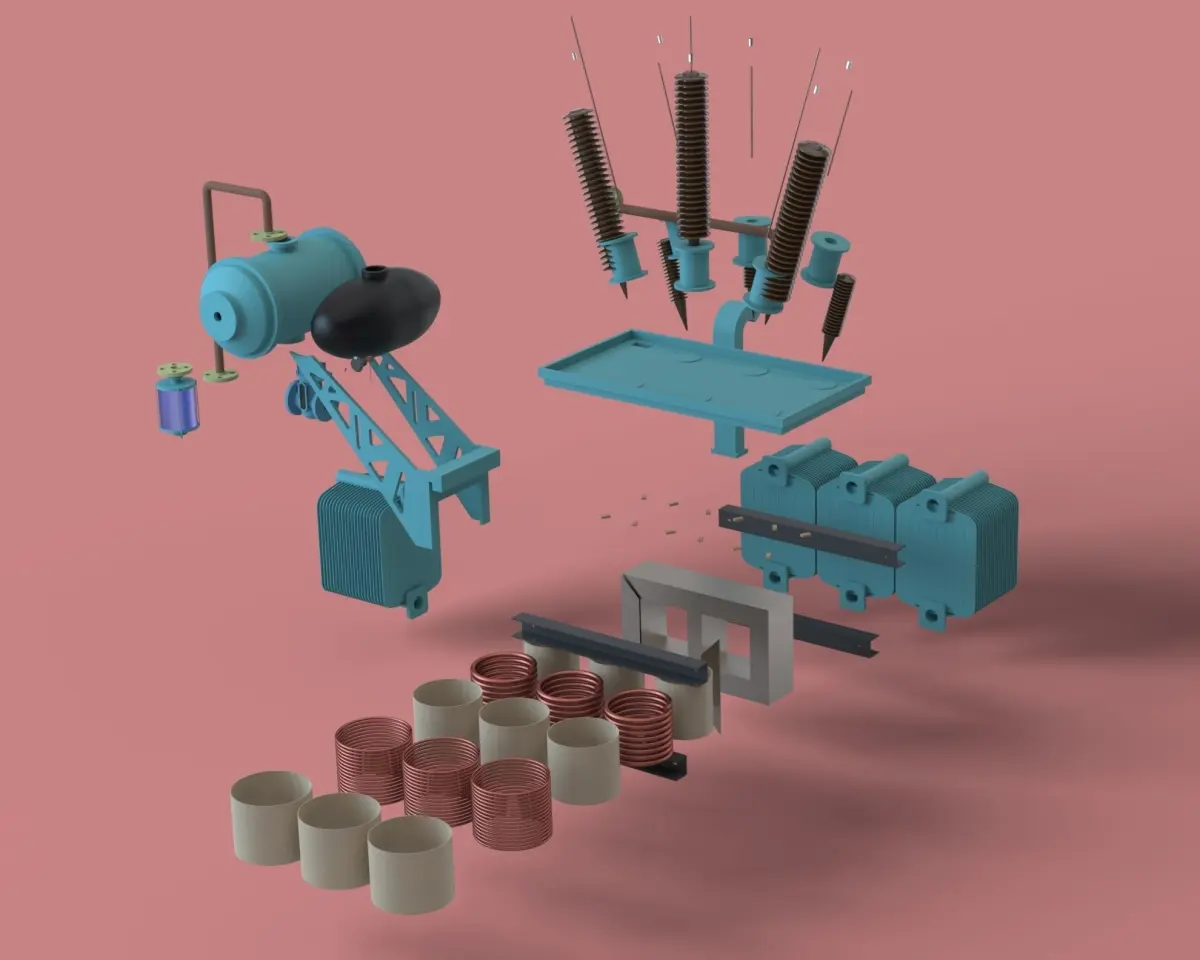 - Laminated sheets(5)-3 iterations of insulation-Copper Windings(2, N1>N2)-Supports-Outer container, Lid-Oil tank-Air conservator-Breather-Buccholz relay-Radiators(4)-High Voltage bushings(3)-Low voltage bushings(3)-Explosion vent-Drain pipe -Piping done with Solidworks RoutingRendering done on Solidworks Visualize