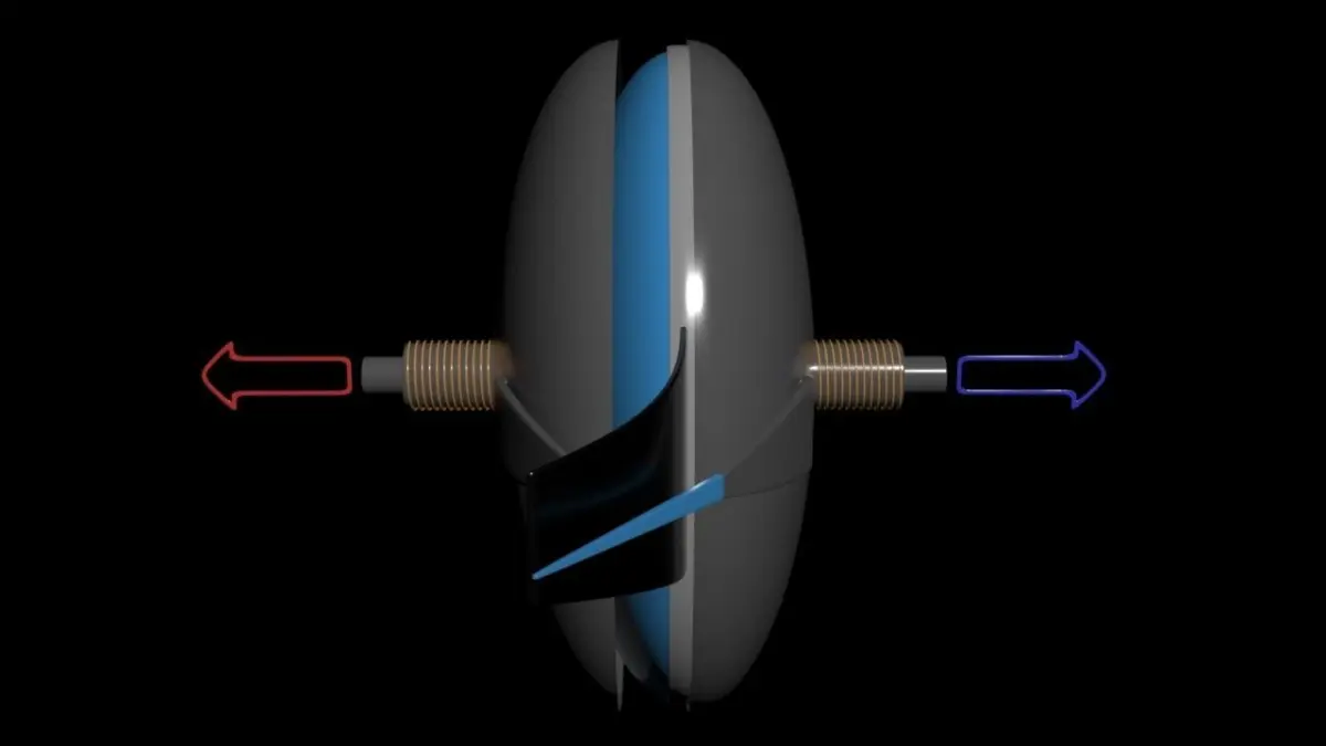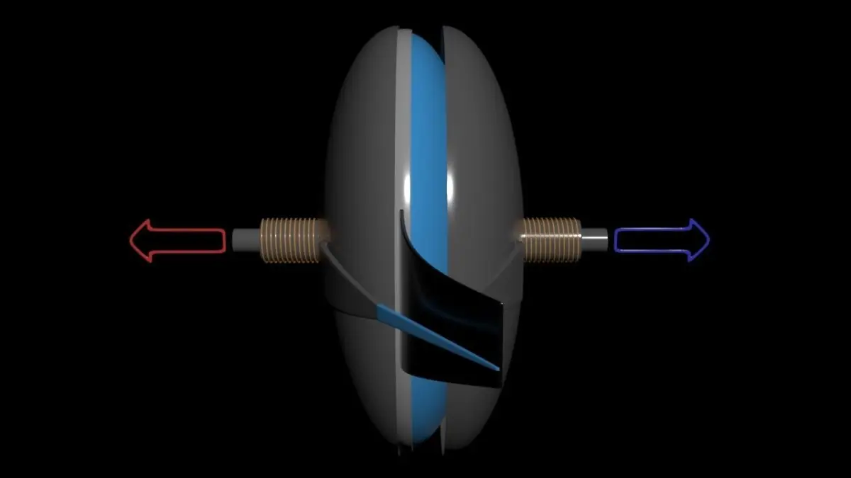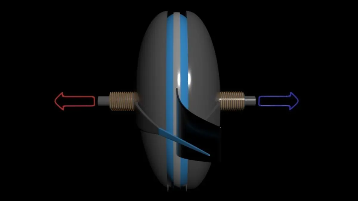 A simple setup of a steel rod being pushed and pulled back and forth electrically, using coils that push and pull electromagnets. to the rod is connected a slightly compressed aerodynamic spherical shape, which is easily moved back and forth, along with the rod. if pushed, the shape pushes and compresses water or air into the stator, which is then aimed backwards at a rubber tail, able to in turn move back and forth, attached to the compressed central moving shape. by powering both sides in turn we get a push and a pull in between the stator shape, pushing air in a certain direction, namely backwards along the tail, for the tail to then push it along again mechanically.