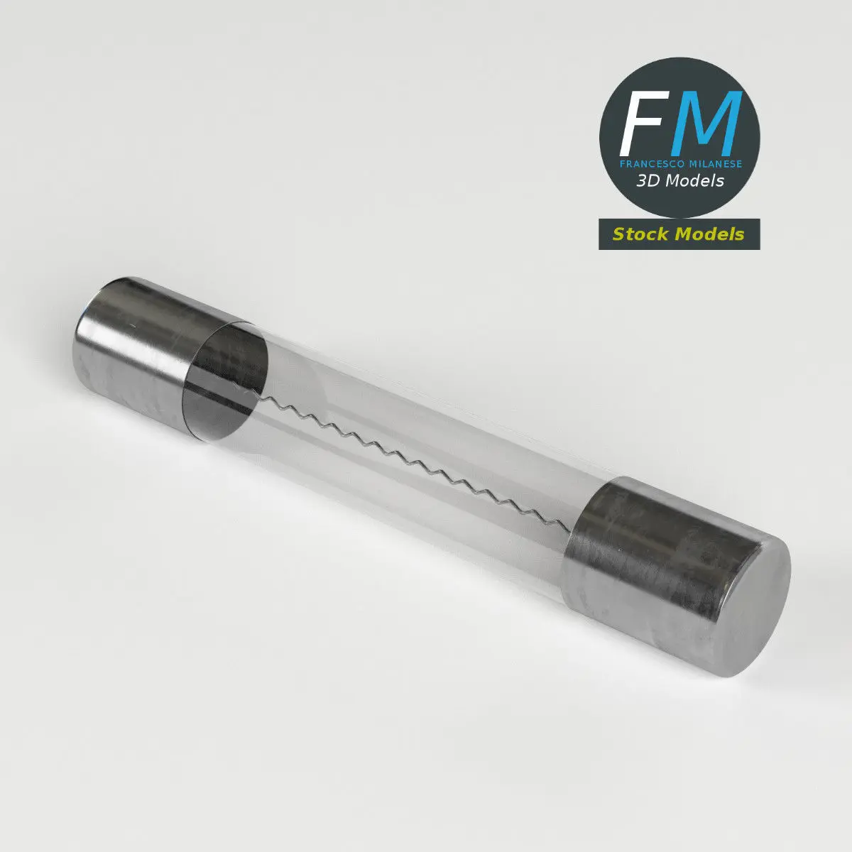 Electronic axial fuse 3D Model. 2 objects (metal, glass), each one with its own non overlapping UV Layout map, Material and PBR Textures set. Production-ready 3D Model, with PBR materials, textures, non overlapping UV Layout map provided in the package.