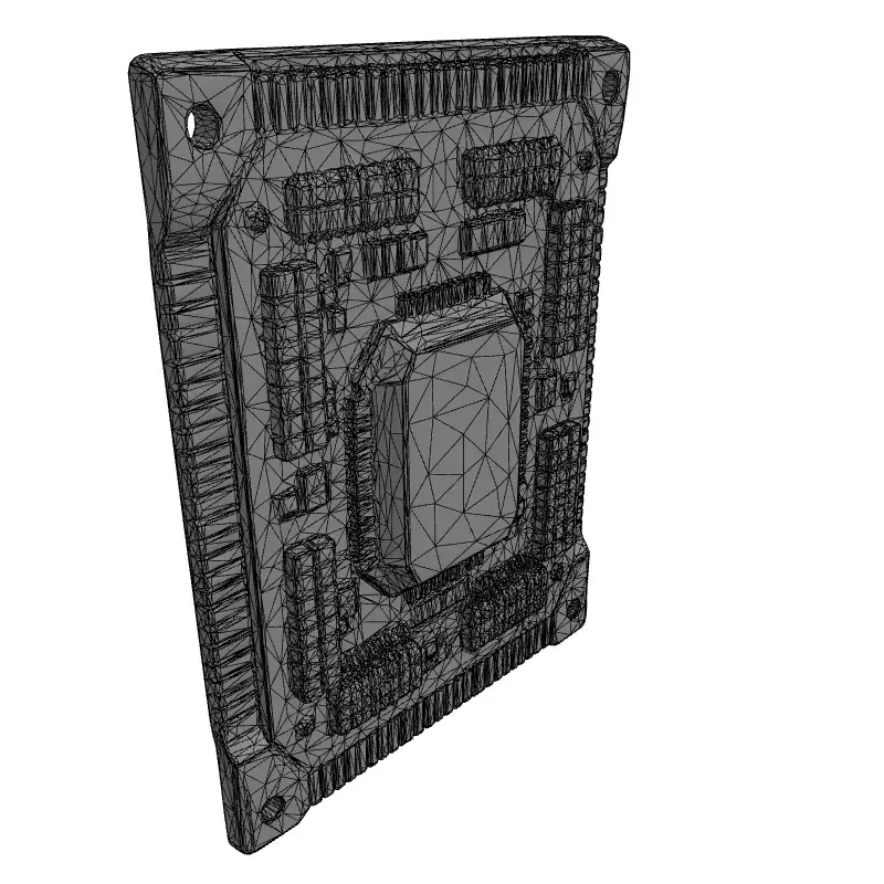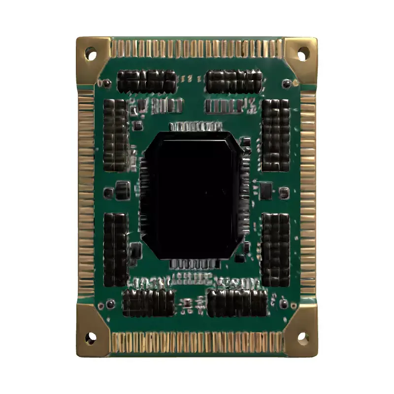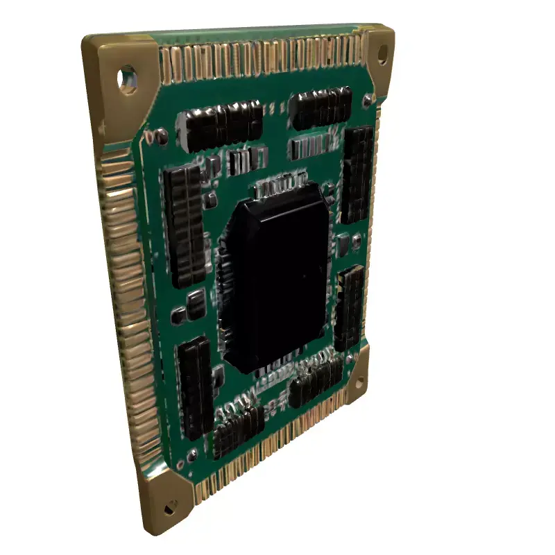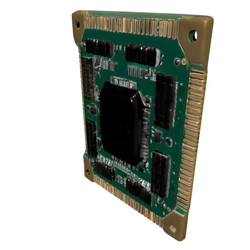 This is a meticulously crafted 3D model of an electronic circuit board module, designed with high fidelity to represent a typical computer or industrial electronic component. The model showcases a vibrant green Printed Circuit Board (PCB) densely populated with a variety of surface-mounted devices, including integrated circuits (ICs), resistors, capacitors, and a prominent central chip package. Its edges feature realistic gold-plated contacts, adding to its authentic appearance. This versatile asset is perfect for a wide range of applications, from enhancing virtual environments in game development, especially for futuristic or industrial settings, to providing realistic props for architectural visualizations of data centers, offices, or technology labs. It is also well-suited for augmented reality (AR) experiences, detailed digital art compositions, product renderings, and educational simulations. The model boasts clean, optimized topology, ensuring smooth performance in real-time applications while also being suitable for high-resolution static renderings. It comes fully UV unwrapped with PBR (Physically Based Rendering) textures, providing a consistent and realistic material representation across different rendering engines. Supported file formats include GLB, OBJ, FBX, USD, DAE, ABC, and PLY, ensuring broad compatibility. Whether you need a detailed component for close-up shots or an optimized asset for large-scale scenes, this circuit board module is ready to integrate into your projects.