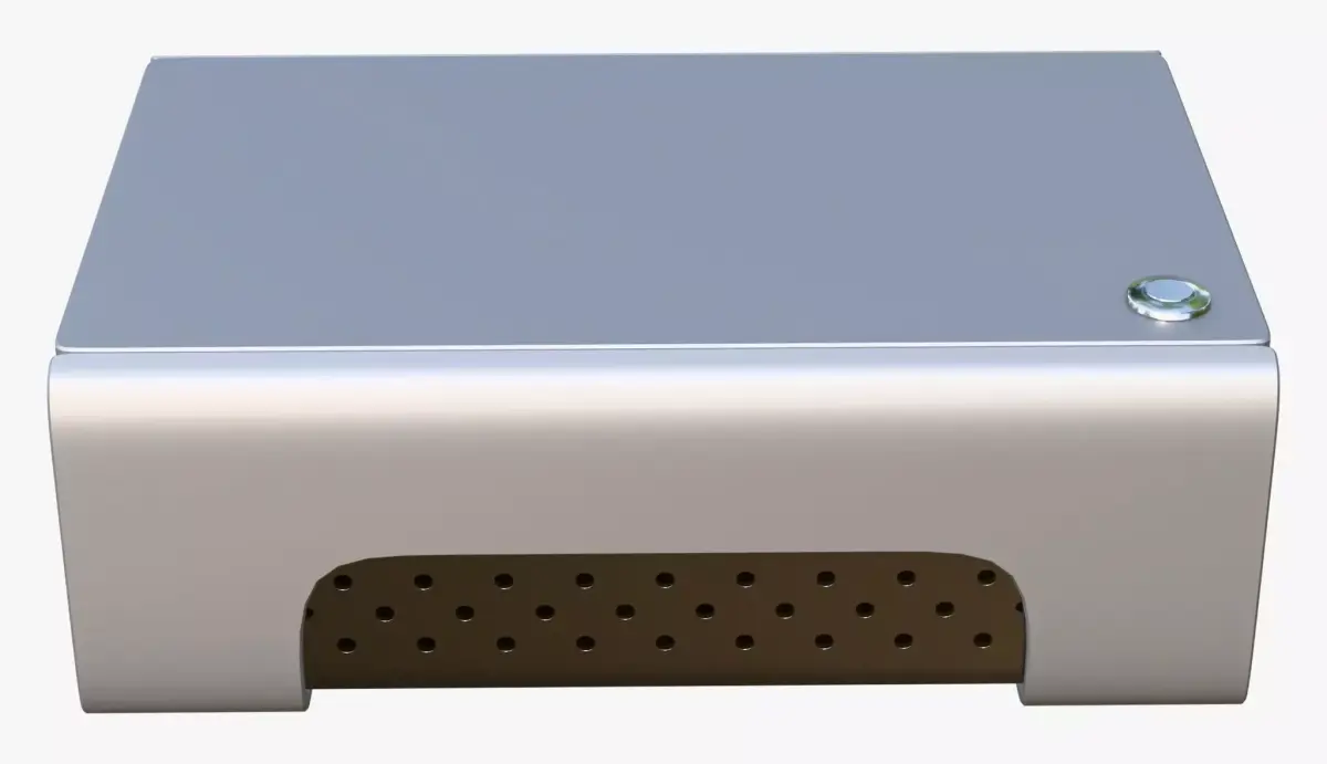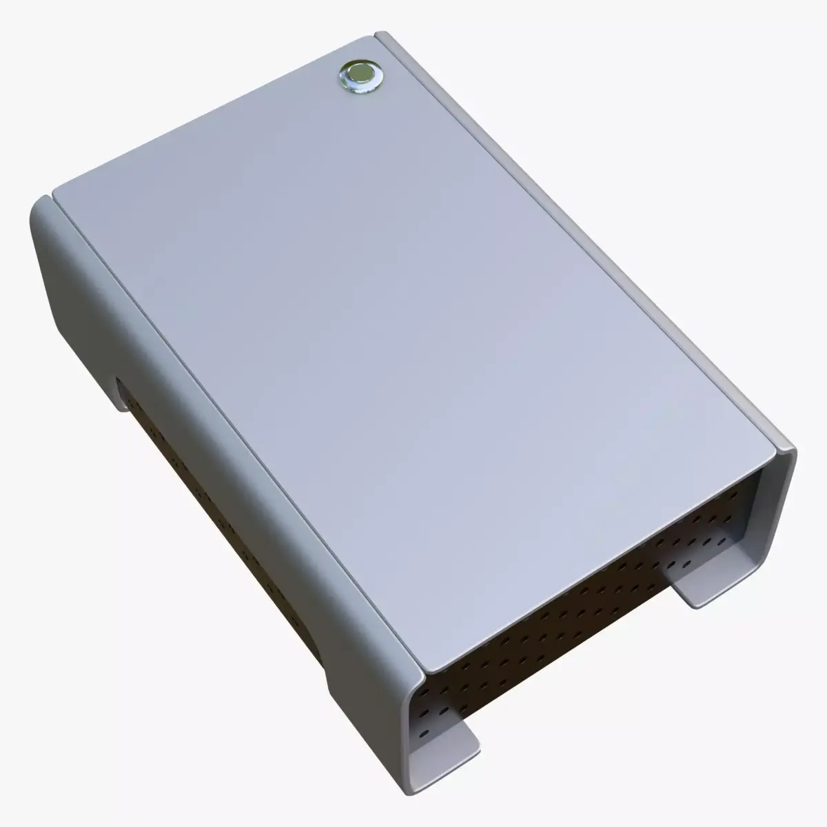 Modern electronics enclosure designed in a minimalist industrial style. The construction consists of a silver aluminum shell and an internal insert with perforation for cooling. The sleek design is complemented by a single chrome button on the top panel.