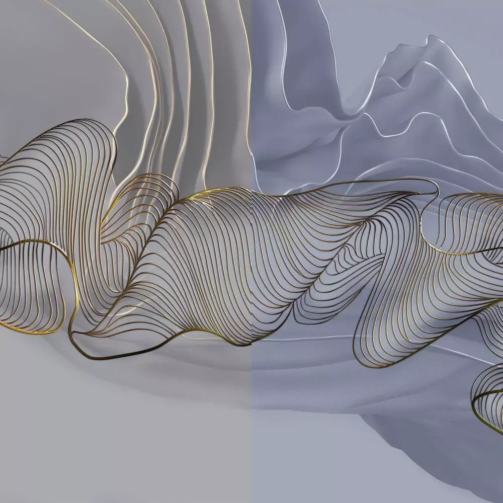 What’s includedFeature‑wall mural design with flowing metallic wave lines in gold and black over layered gauze‑like folds, supplied as a seamless, high‑resolution texture for large‑scale walls and close‑up renders.