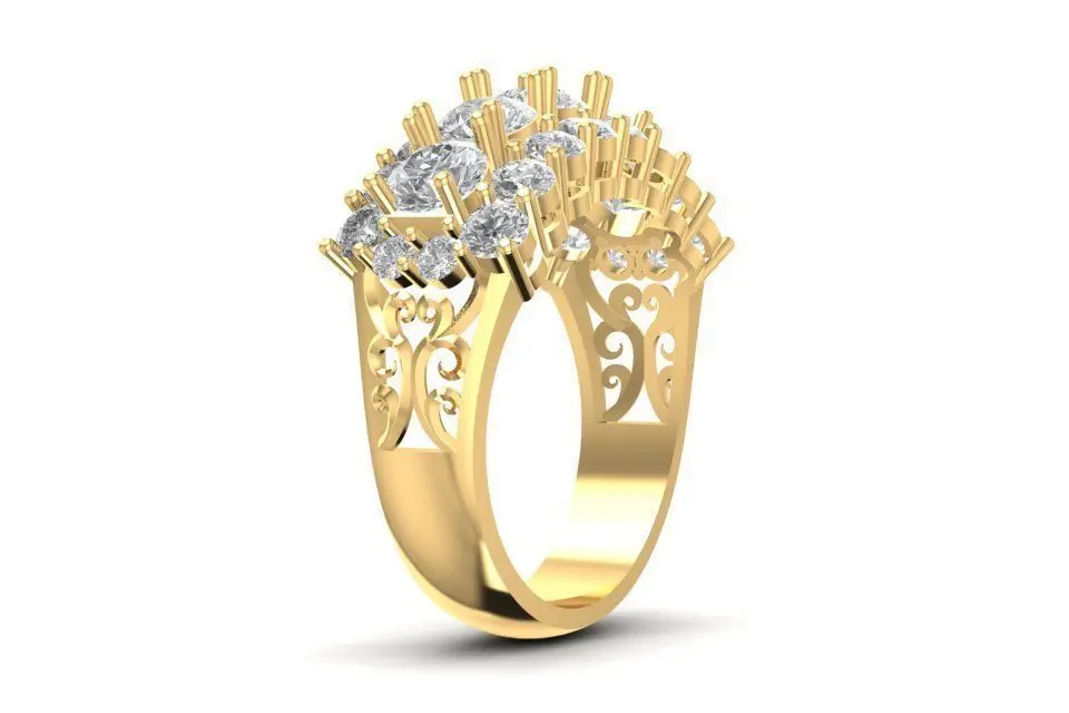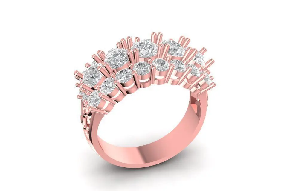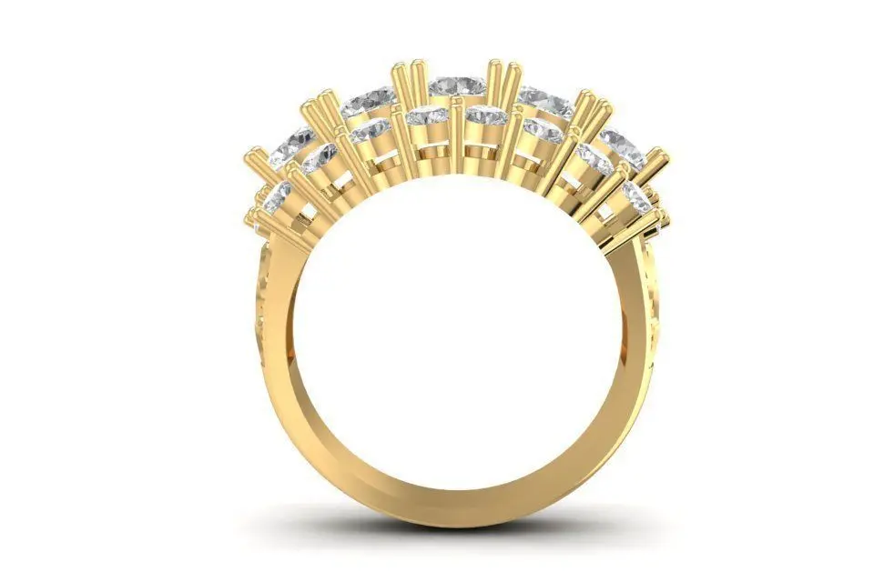 This 3D model showcases an elegant baguette and round diamond cluster ring for women, designed to radiate brilliance and sophistication. The ring features alternating baguette-cut and round-cut stones, carefully arranged in multiple rows to maximize sparkle and symmetry. Its open gallery provides light reflection and comfort while maintaining durability.
