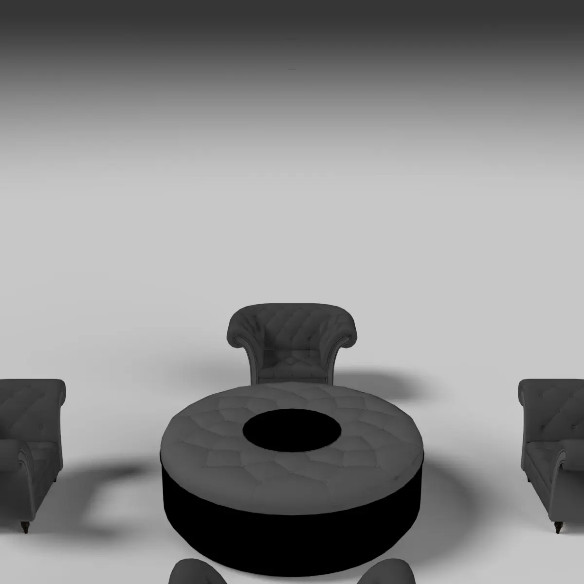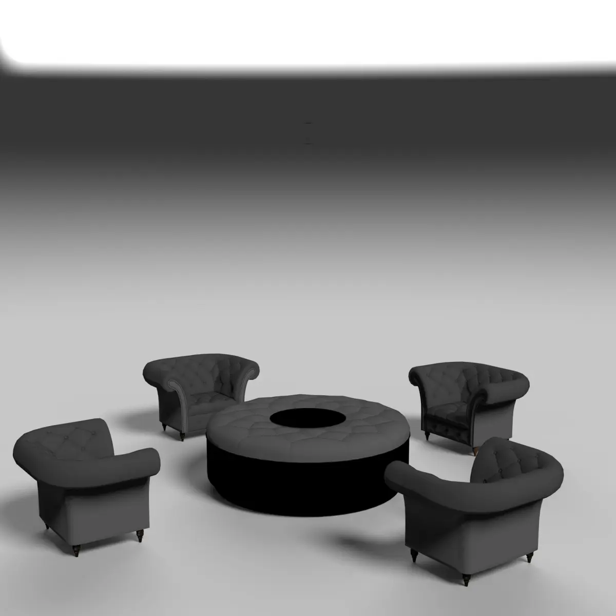 luxurious lounge furniture set arranged in a circular configuration. It includes four tufted black armchairs with rolled arms and a large, round central ottoman or seating island. The ottoman has a hollow circular center, potentially for decorative or functional purposes. The overall aesthetic is classic and sophisticated, suitable for upscale lounges, hotel lobbies, or executive waiting areas