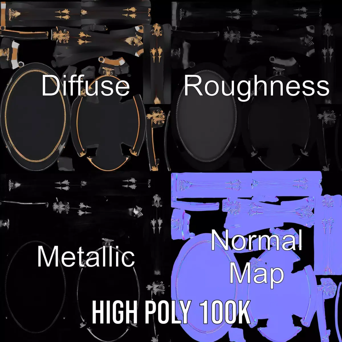 The Elegant Black Mahogany Table model pack features a beautifully crafted table with intricate gold detailing on graceful legs, embodying classic elegance and sophistication. Each model has 3 levels of detail: low-poly (1000 triangles for mobile), middle-poly (10,000 triangles for environment), and high-poly (100,000 triangles), which allows for the use of this model in production rendering (such as 3ds Max, Maya,Cinema4D, Blender, Vray/Corona/Cycles and all other), game engines (Unity and Unreal compatible), and interactive presentations, providing a choice of detail based on the LOD System principle. This model is ideally suited for high-end interior design projects, historical scene reconstructions, and luxury architectural visualizations. The model's textures are PBR, Diffuse, NormalMap, and reflection/roughness/metallic, which are suitable for any modern rendering engine. All models accurately unwrapped and have no overlapping UVs. All textures are 4096*4096 in size. If you liked this model, please like and leave a comment!