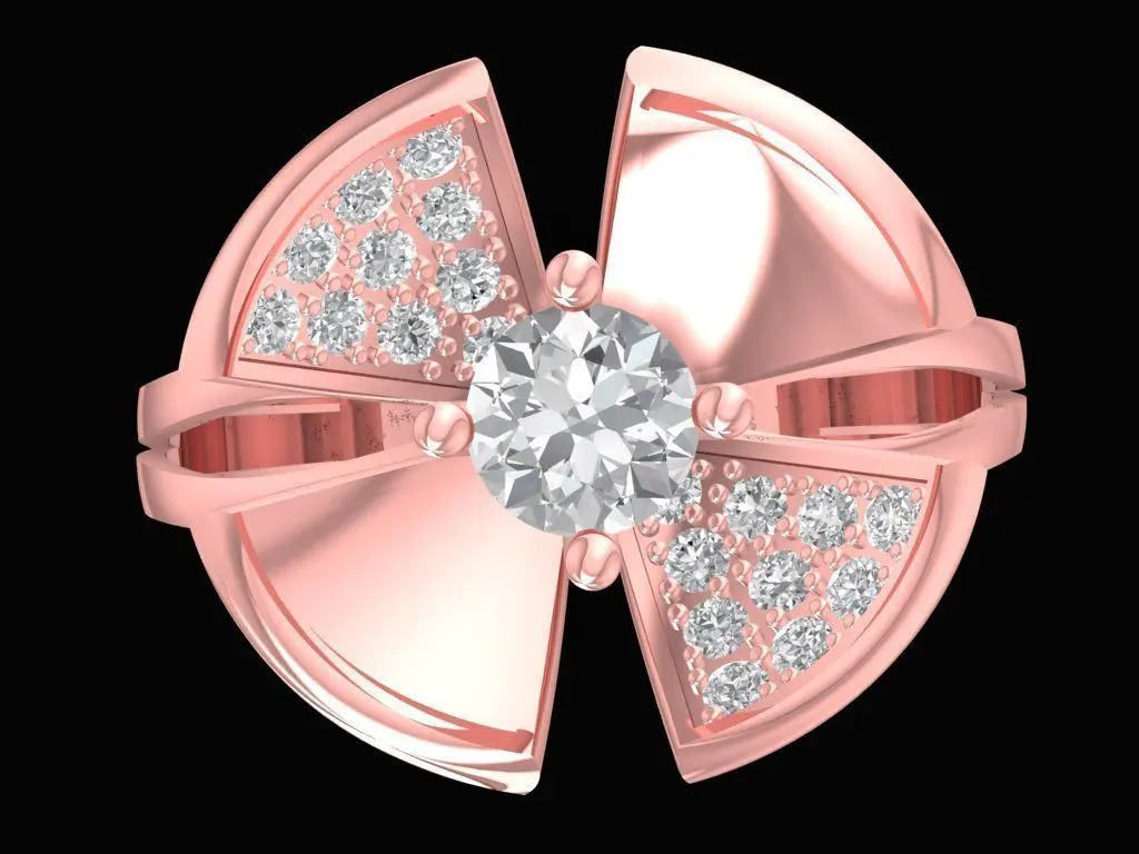 This 3D jewelry model features an elegant bow diamond ring designed for women, combining graceful curves with modern luxury. The ring’s centerpiece is a brilliant round-cut diamond set at the heart of a bow-shaped design, symbolizing charm, beauty, and femininity. The surface of each ribbon is adorned with fine pavé diamonds, adding brilliance and depth to the overall form.