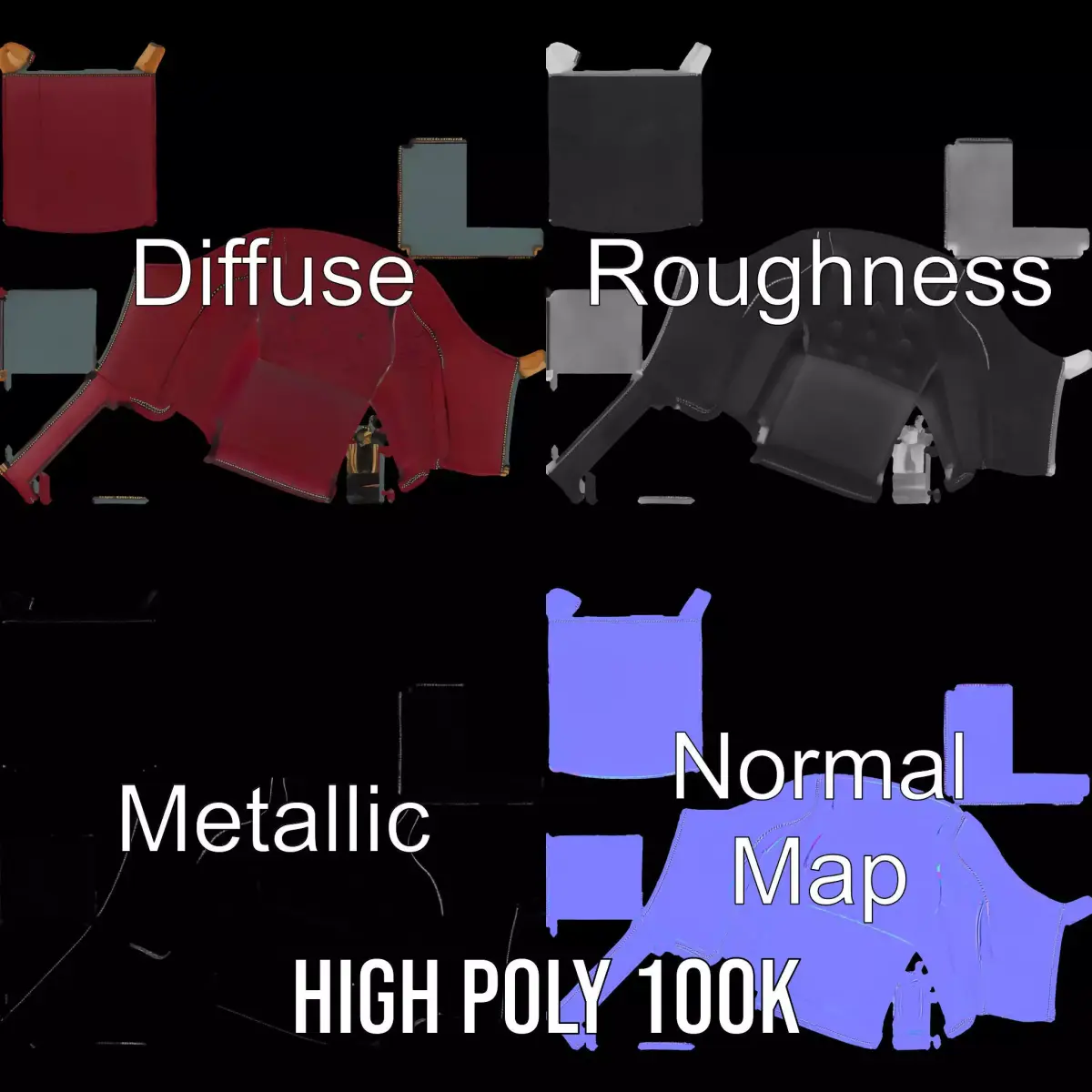 This elegant burgundy armchair model pack features a classic design with luxurious finishing touches, perfect for creating sophisticated interiors. Each model has 3 levels of detail: low-poly (1000 triangles for mobile), middle-poly (10,000 triangles for environment), and high-poly (100,000 triangles), which allows for the use of this model in production rendering (such as 3ds max, Maya, Cinema4D, Blender, Vray/Corona/Cycles and all other), game engines (Unity and Unreal compatible), and interactive presentations, providing a choice of detail based on the LOD System principle.