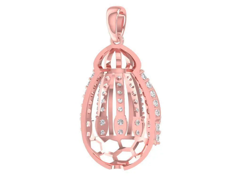 This elegant cage style diamond pendant features a rounded drop silhouette crafted with open lattice bars, showcasing a refined and luxurious aesthetic. Multiple round stones are set along the vertical ribs, creating a sparkling effect from every viewing angle. The airy structure enhances light reflection while maintaining a graceful and feminine look, suitable for daily wear or formal jewelry collections.