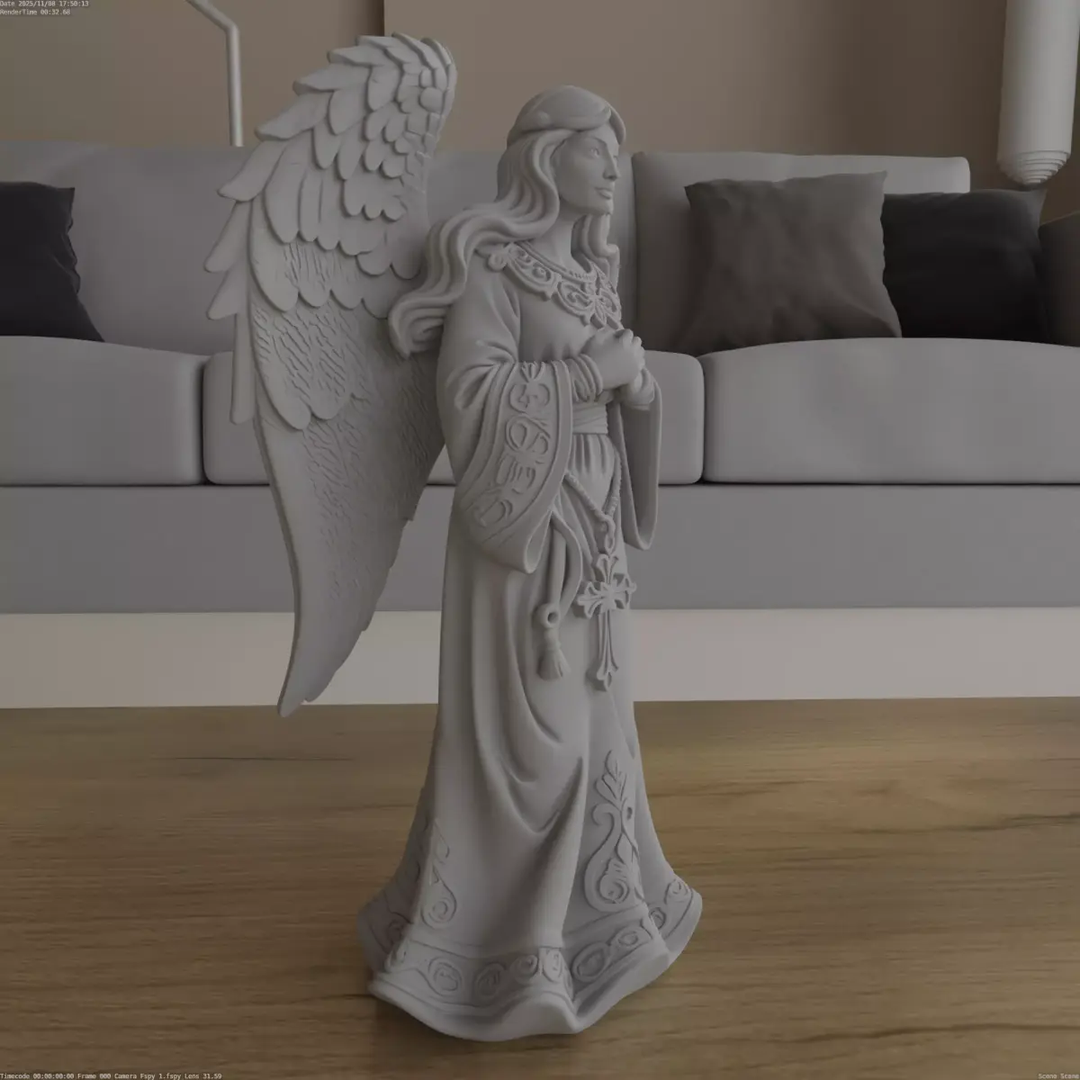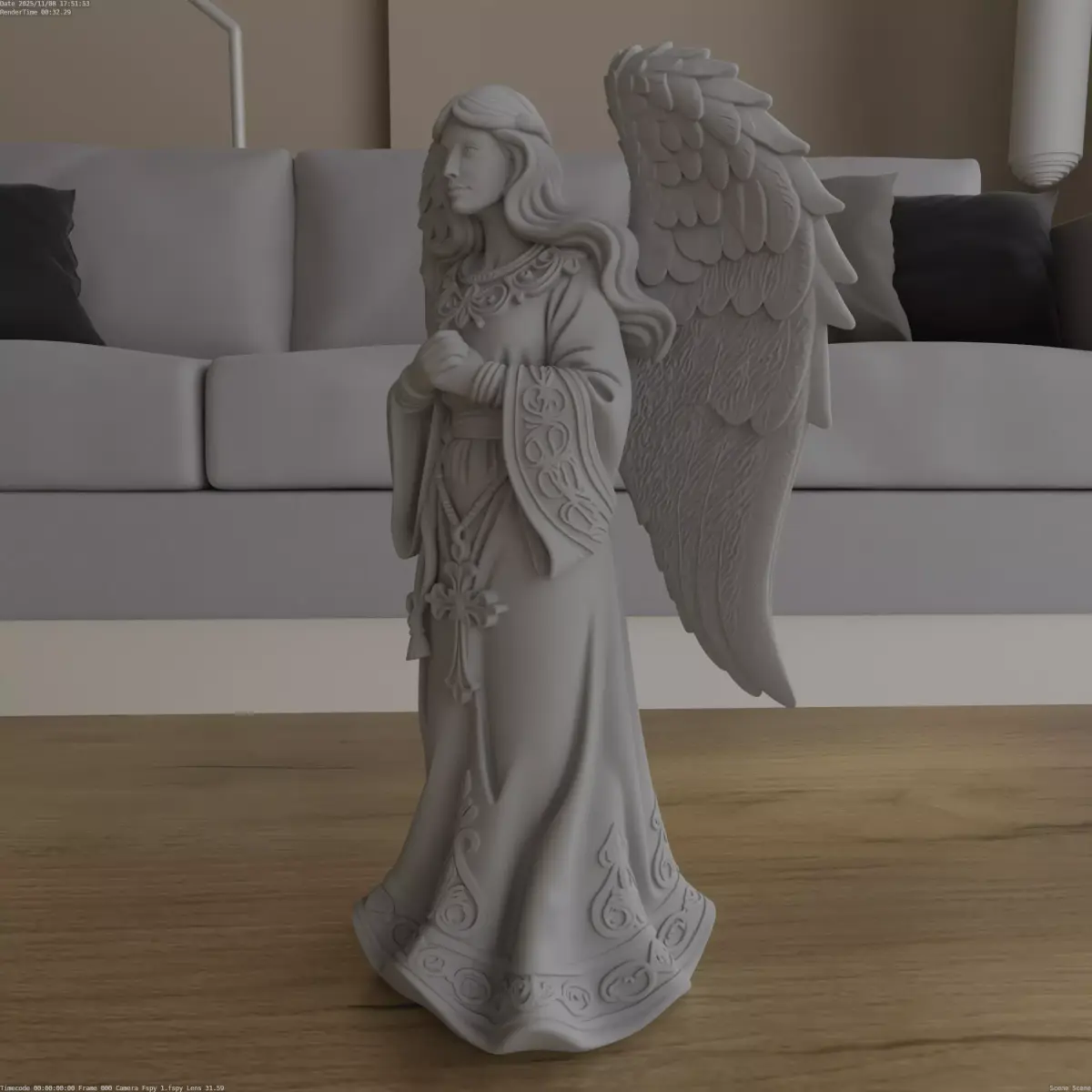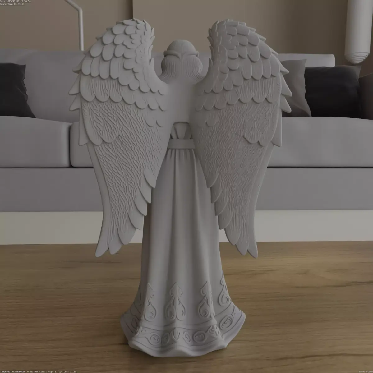 Design ConceptThis 3D model features an elegantly detailed Christmas angel, embodying serenity and grace. Intricate patterns adorn the robe and wings, enhancing its ethereal nature.