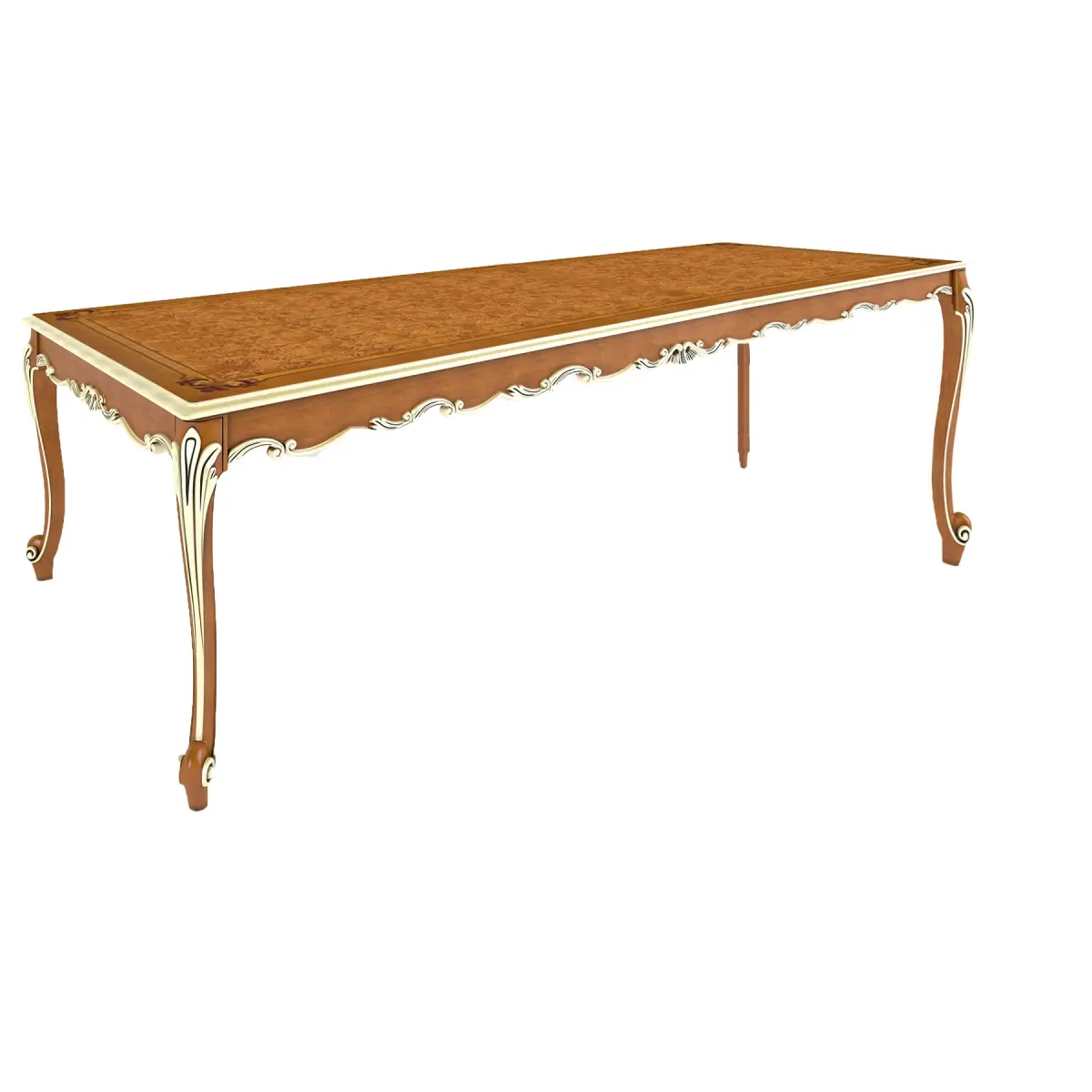 There are many details that make this classic style dining table very luxurious. From solid wood to elegantly handcrafted wood carvings on the legs, to sophisticated golden accents details, this gorgeous piece is ideal for a lavish households decoration.