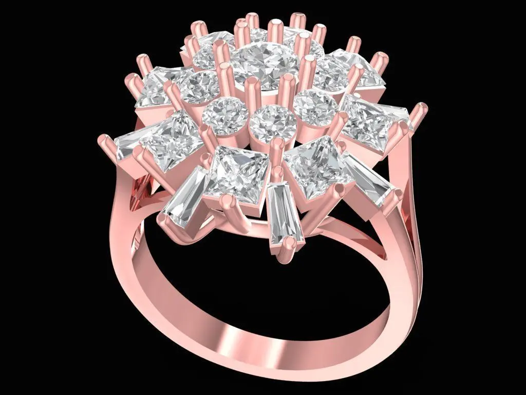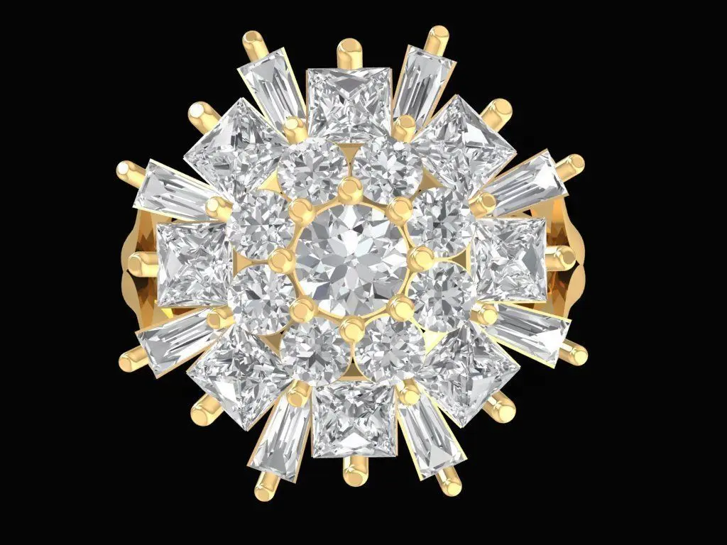 This 3D jewelry model features an elegant cluster diamond ring with a stunning floral arrangement of baguette and round-cut stones. Designed for women who appreciate luxury and artistic craftsmanship, this ring radiates brilliance from every angle. The layered setting enhances light reflection, creating an extraordinary sparkle reminiscent of a blooming flower. Perfect for engagement, evening wear, or fine jewelry collections, this model combines modern precision with timeless beauty. It is production-ready, suitable for gold, silver, or platinum casting, and supports both natural and lab-grown diamonds or cubic zirconia. All preview images show accurate proportions, detailed stone placement, and realistic geometry. The model is optimized for professional jewelers, CAD designers, and 3D printers who need a premium, editable, and watertight jewelry file.
