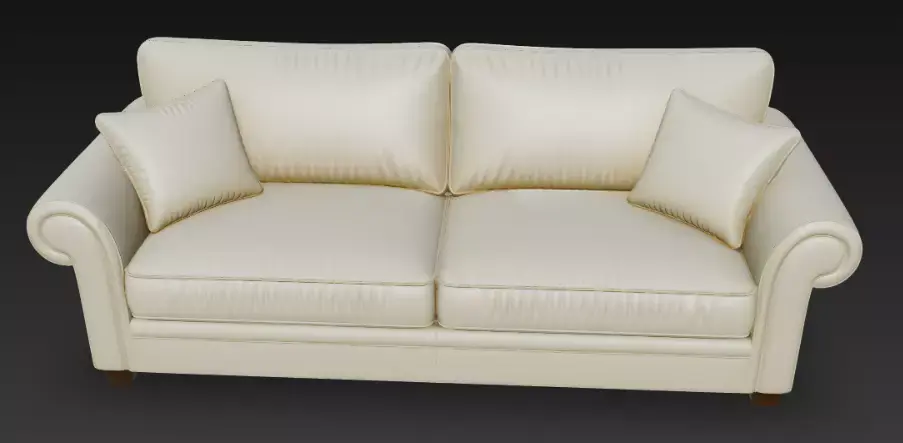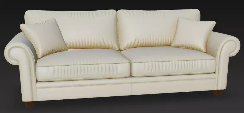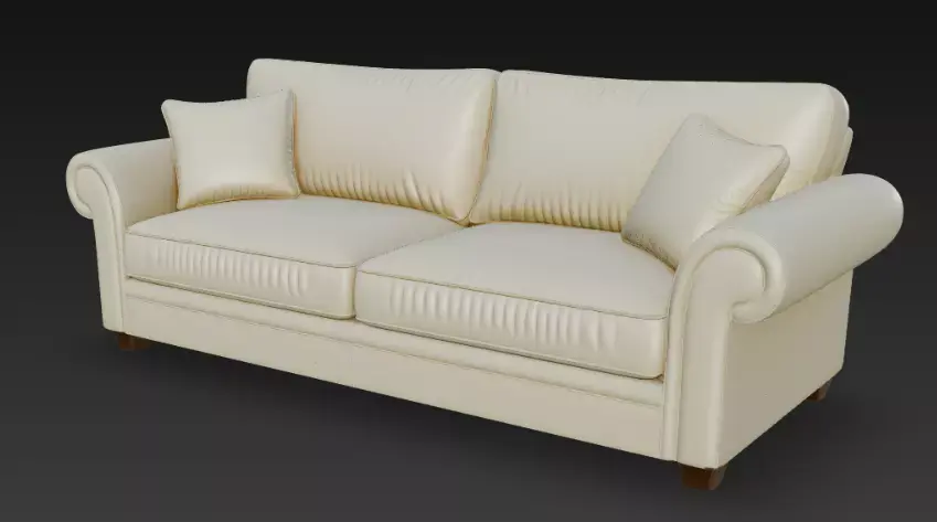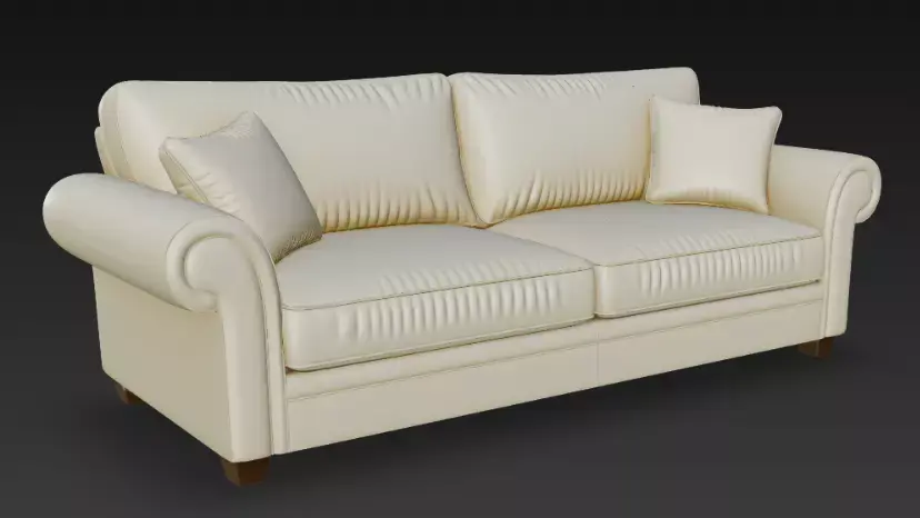 This 3D model presents an elegant cream leather sofa with rolled arms, plush cushions, and matching throw pillows, perfect for luxurious interior design projects. The model features detailed stitching, smooth textures, and solid wooden legs, making it ideal for virtual staging or high-end furniture visualization.