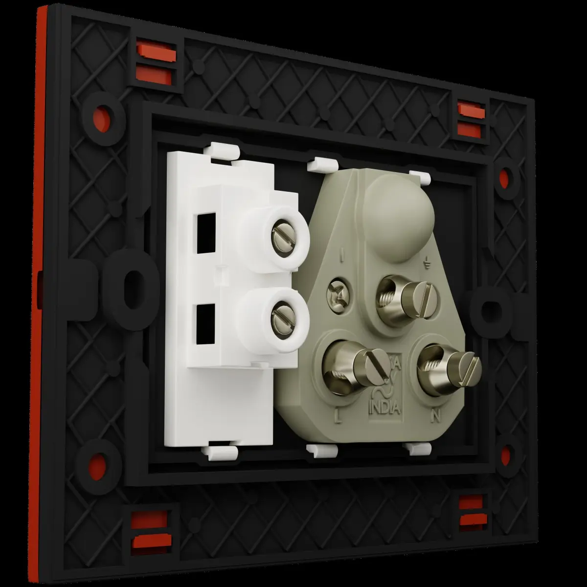 Elegantly desinged switch board in Crimson red matte panel with High voltage socket detailed with premium industry standard materials used for sustaining the high voltage electricity.The Switch design is curved and you can see the contours adding aesthetics to it. The Socket and the switch is is bordered with black PBR shaded plastic complimenting to the premium design.