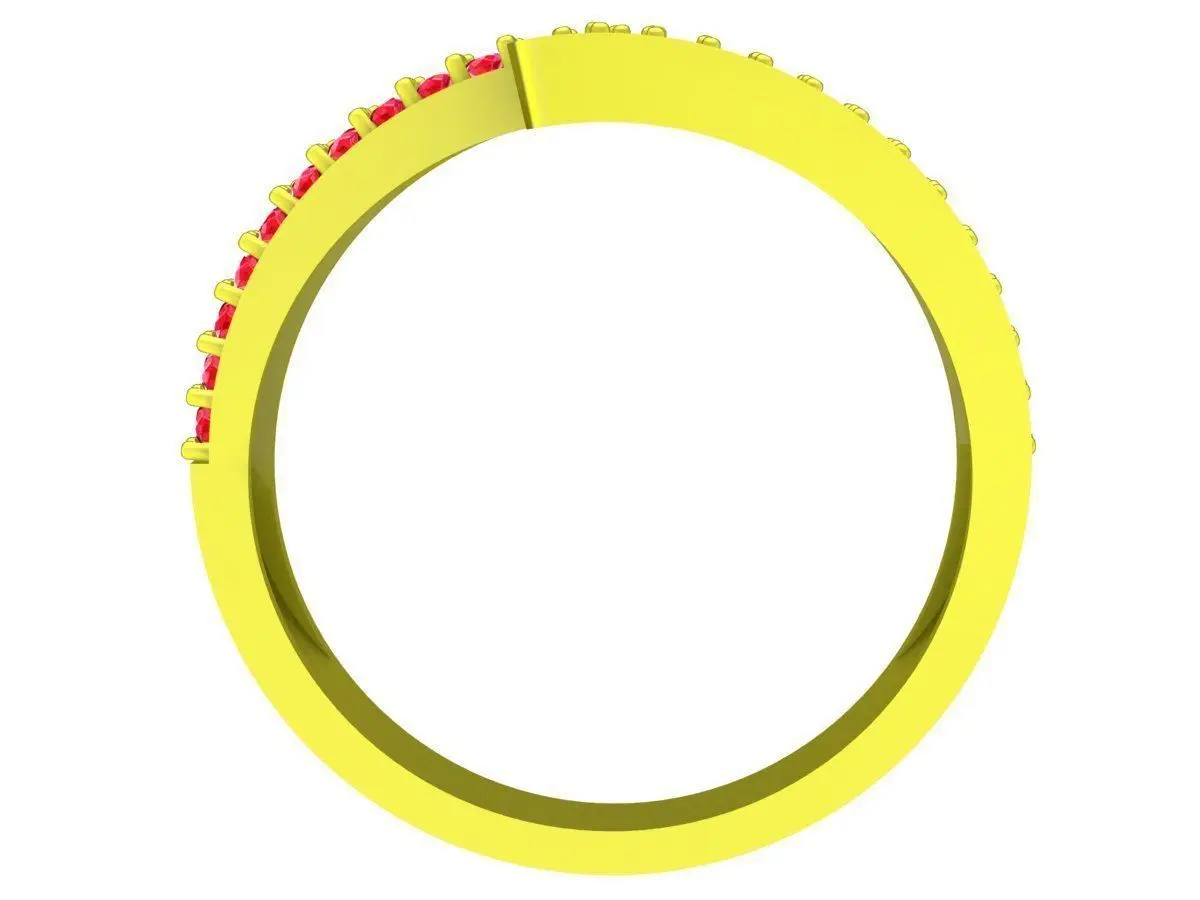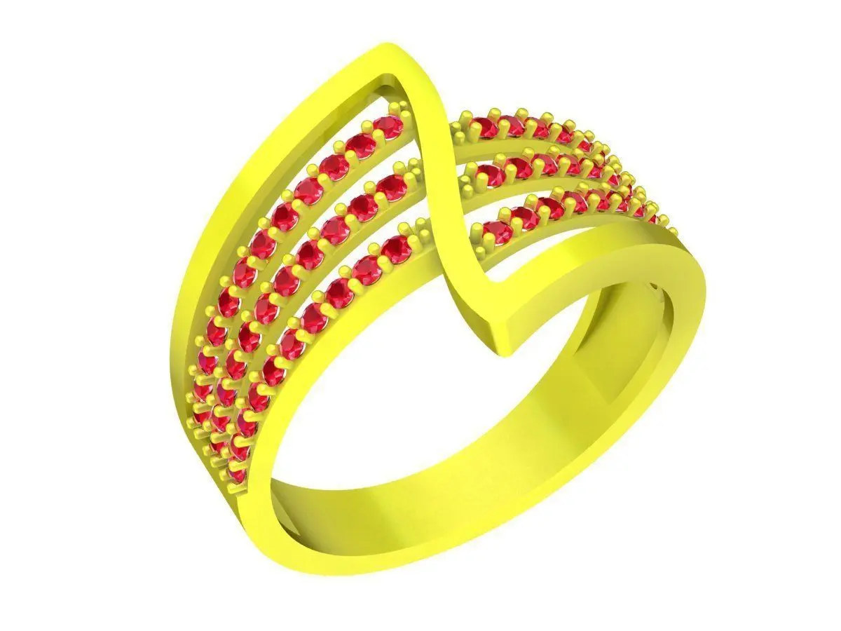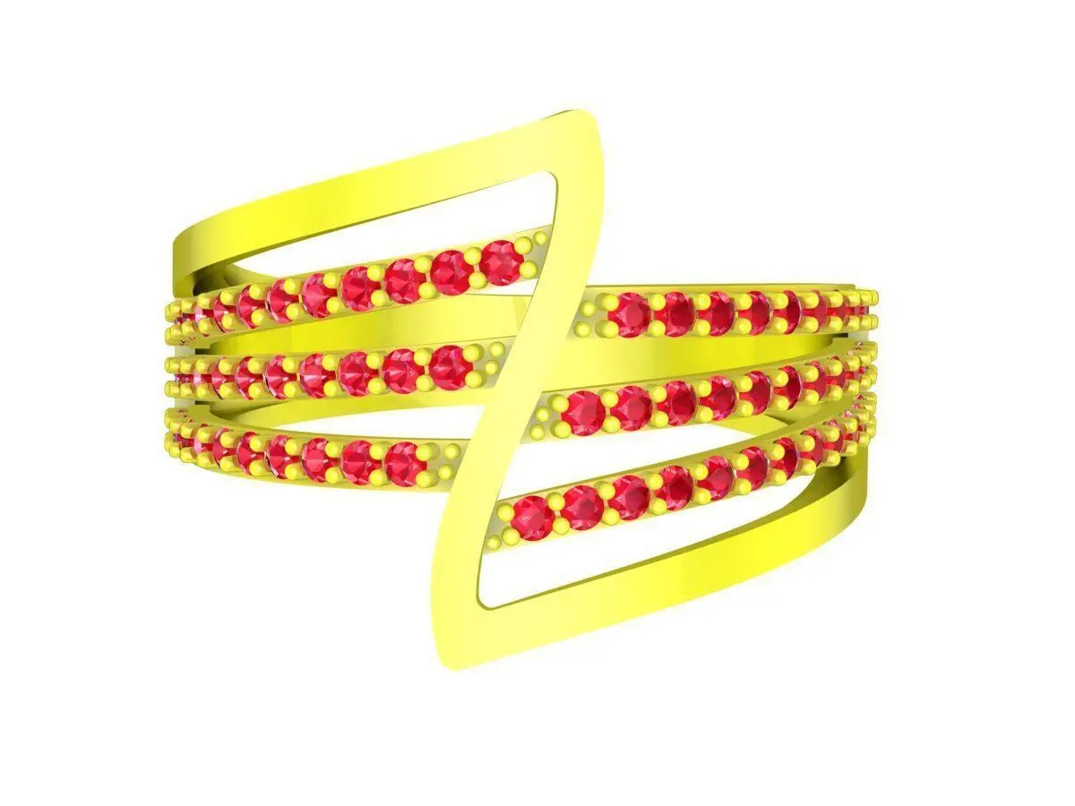 This elegant curved ring features a modern Z-shaped structure combined with multiple parallel rows of round red gemstone settings. The layered design creates depth and visual movement while maintaining a balanced and comfortable ring profile.