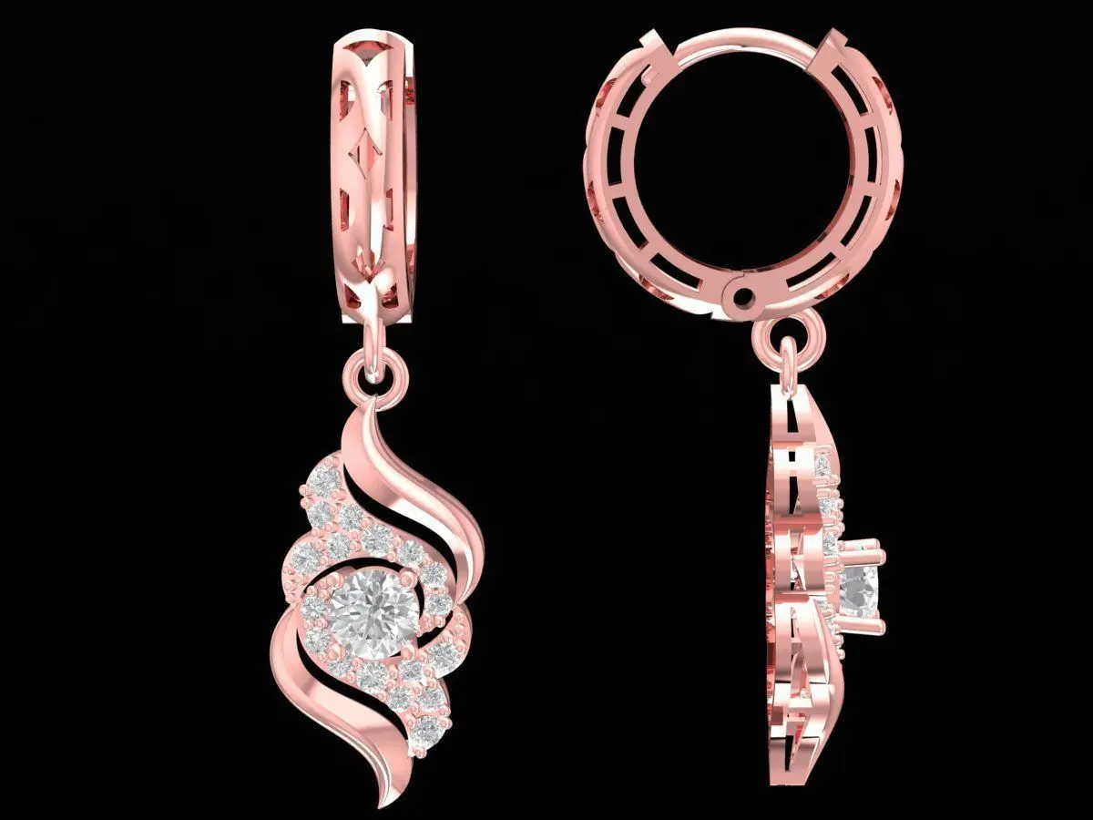 This 3D model showcases a pair of elegant drop earrings with a graceful twisted design, beautifully accented with brilliant round diamonds.