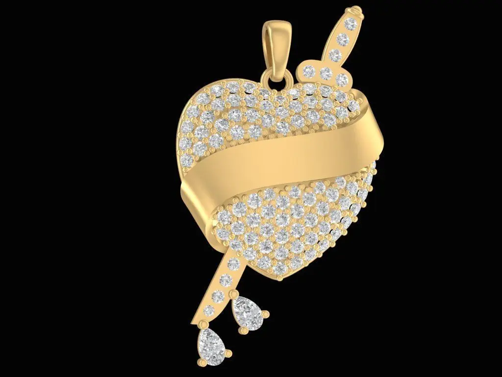 This 3D model showcases an elegant heart-shaped pendant wrapped with a smooth ribbon design, symbolizing love, devotion, and eternal connection. The front surface is fully encrusted with fine round-cut diamonds, creating a luxurious sparkle under any light. The soft ribbon band curves diagonally across the heart, giving a sense of gentle movement and feminine grace.