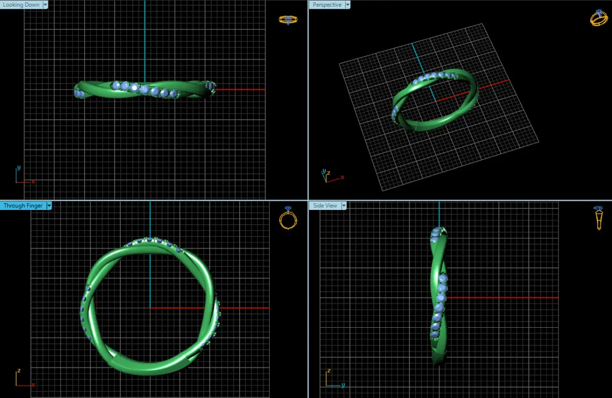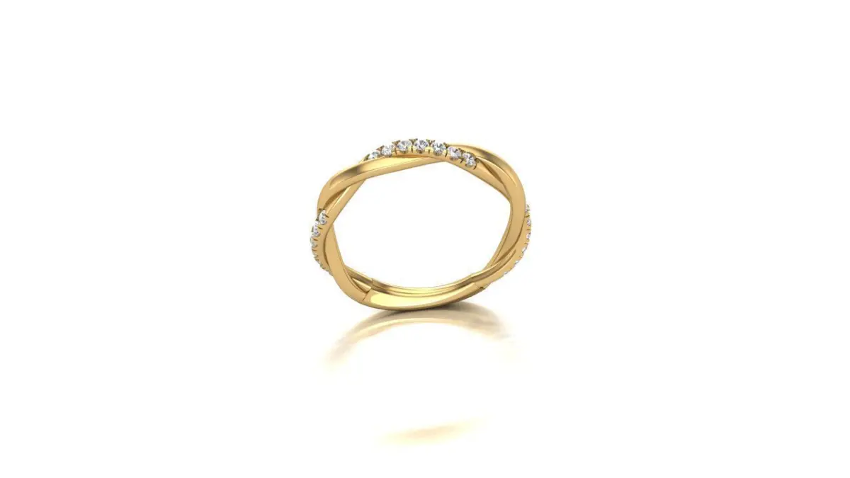 A row of sparkling diamonds is delicately set into the twist of the band. These diamonds add a touch of glamour and brilliance to the design, elevating its elegance. The diamonds are carefully selected for their cut, clarity, and color, ensuring maximum sparkle. Their placement along the curve of the twist accentuates the band's movement and adds a subtle yet dazzling detail.