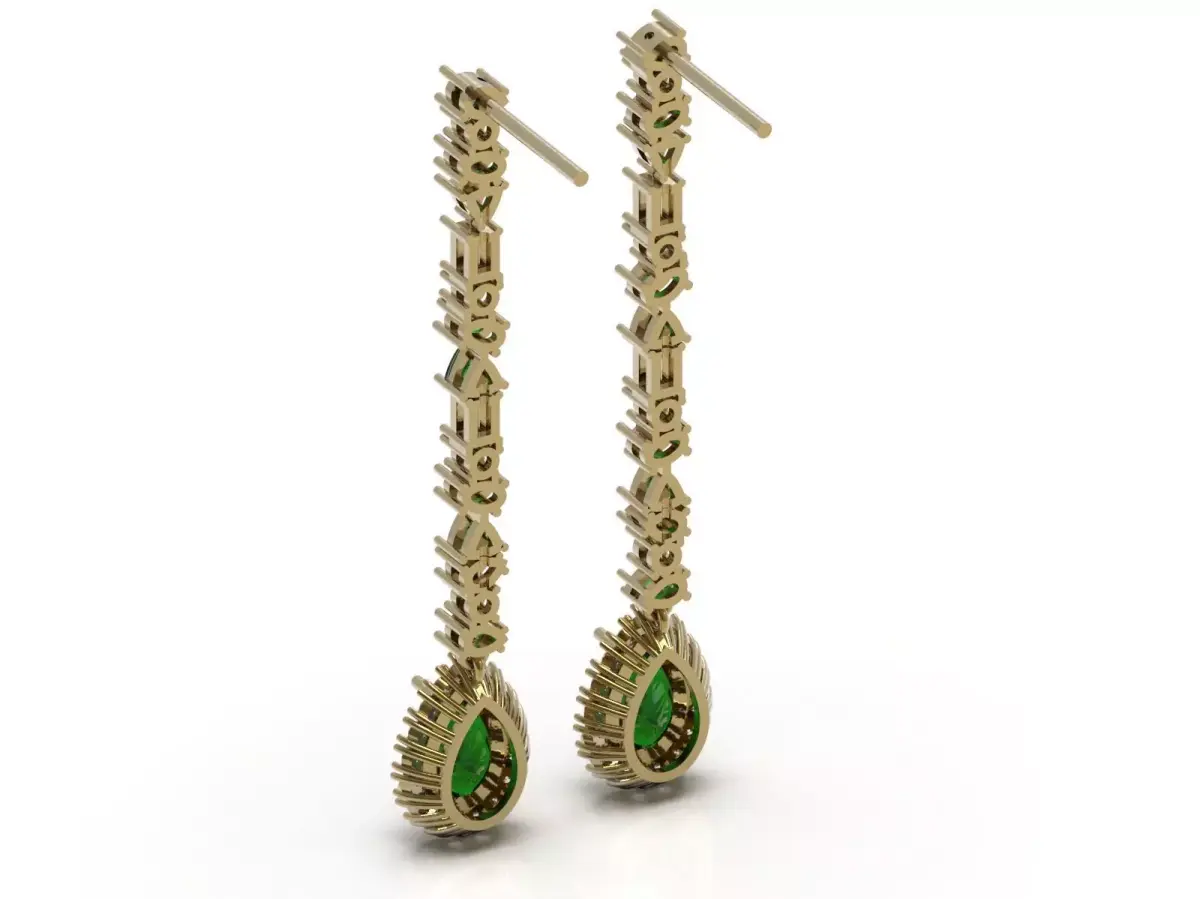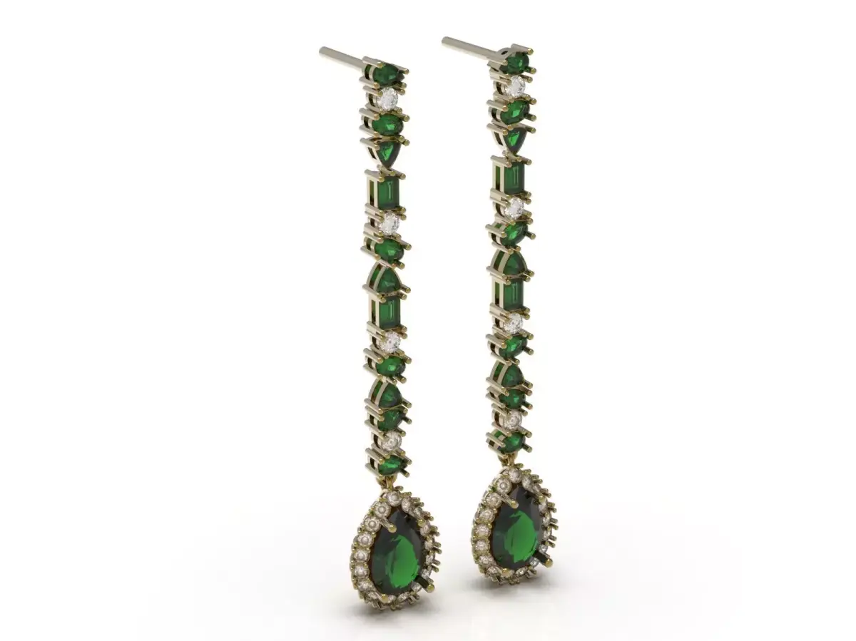 Add a touch of timeless beauty to your collection with these stunning earrings, featuring vibrant green emeralds surrounded by sparkling diamonds. The elegant design includes a delicate row of diamonds and emeralds, culminating in a striking teardrop-shaped emerald centerpiece. This high-quality 3D model is perfect for those who appreciate luxury and elegance.