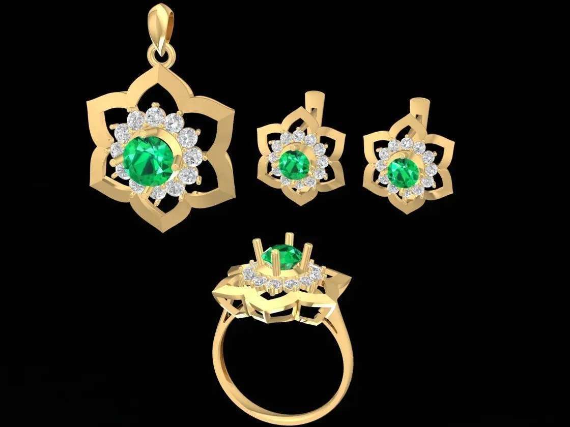 This 3D model presents an elegant emerald flower jewelry set for women, including a matching ring, pendant, and earrings.