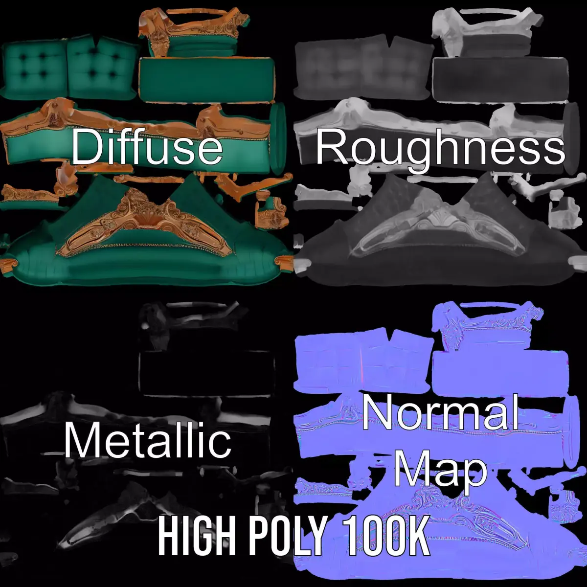 This intricately designed elegant emerald sofa brings a touch of luxury and class to any virtual space. The green velvet upholstery is paired with ornate wooden carvings, making it perfect for historical visuals, luxury interiors, or architectural presentations. Each model has 3 levels of detail: low-poly (1000 triangles for mobile), middle-poly (10,000 triangles for environment), and high-poly (100,000 triangles), which allows for the use of this model in production rendering (such as 3ds Max, Maya, Cinema 4D, Blender, Vray/Corona/Cycles and all others), game engines (Unity and Unreal compatible), and interactive presentations, providing a choice of detail based on the LOD System principle. The model's textures are PBR, Diffuse, NormalMap, and reflection/roughness/metallic, suitable for modern rendering engines. All models are accurately unwrapped with no overlapping UV. All textures are 4096*4096 in size. Please like and leave a comment if you enjoyed this model.